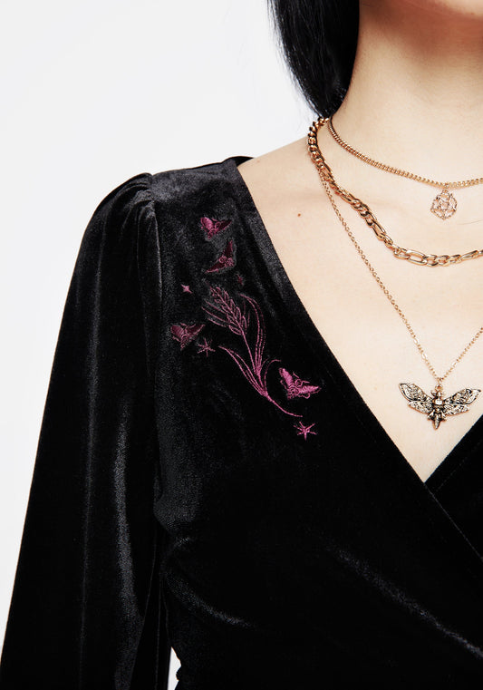 Cleome Floral Spiderweb Embroidered Velour Faux Wrap Mini Dress