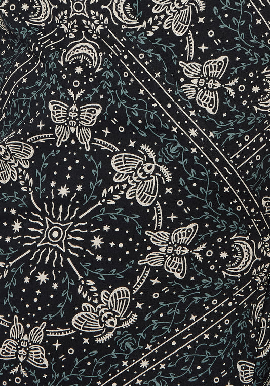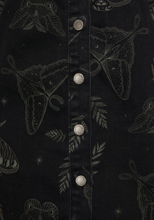 Callopistria Moth Print Denim Mini Apron Dress