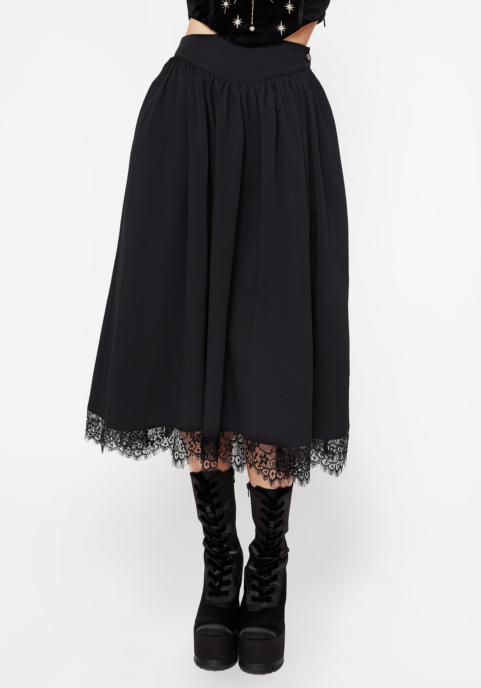- Midaxi-length pleated skirt with a wide, dipped waistband