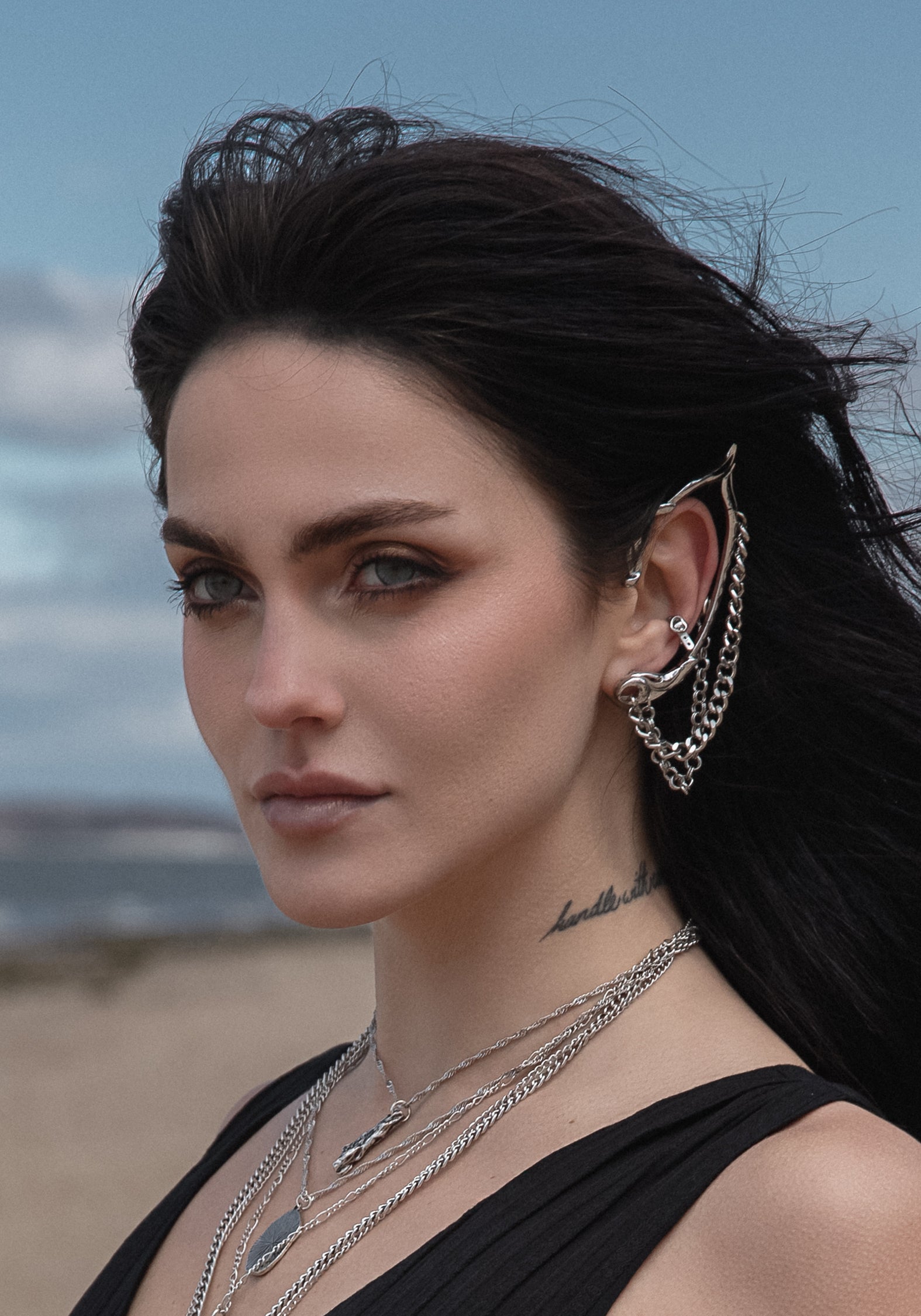Time for some elf-care. This ear cuff is sculpted to surround your ear with a delicate art nouveau inspired motif to give you that elven glow. Two chains add a little edge. It’s secured by a single lobe piercing & a support bar, so anyone with a common ear piercing can enjoy this statement look.