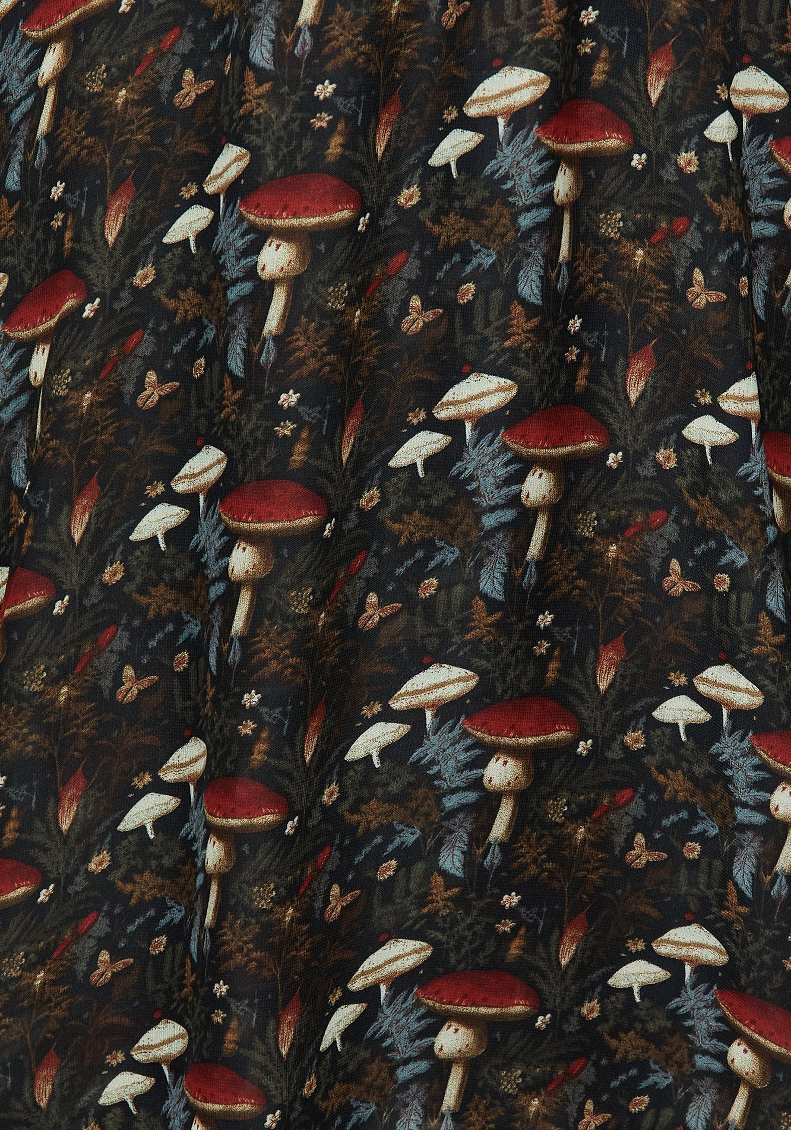 - Earthy mushroom forest all-over print accented with red caps & blue-green leaves