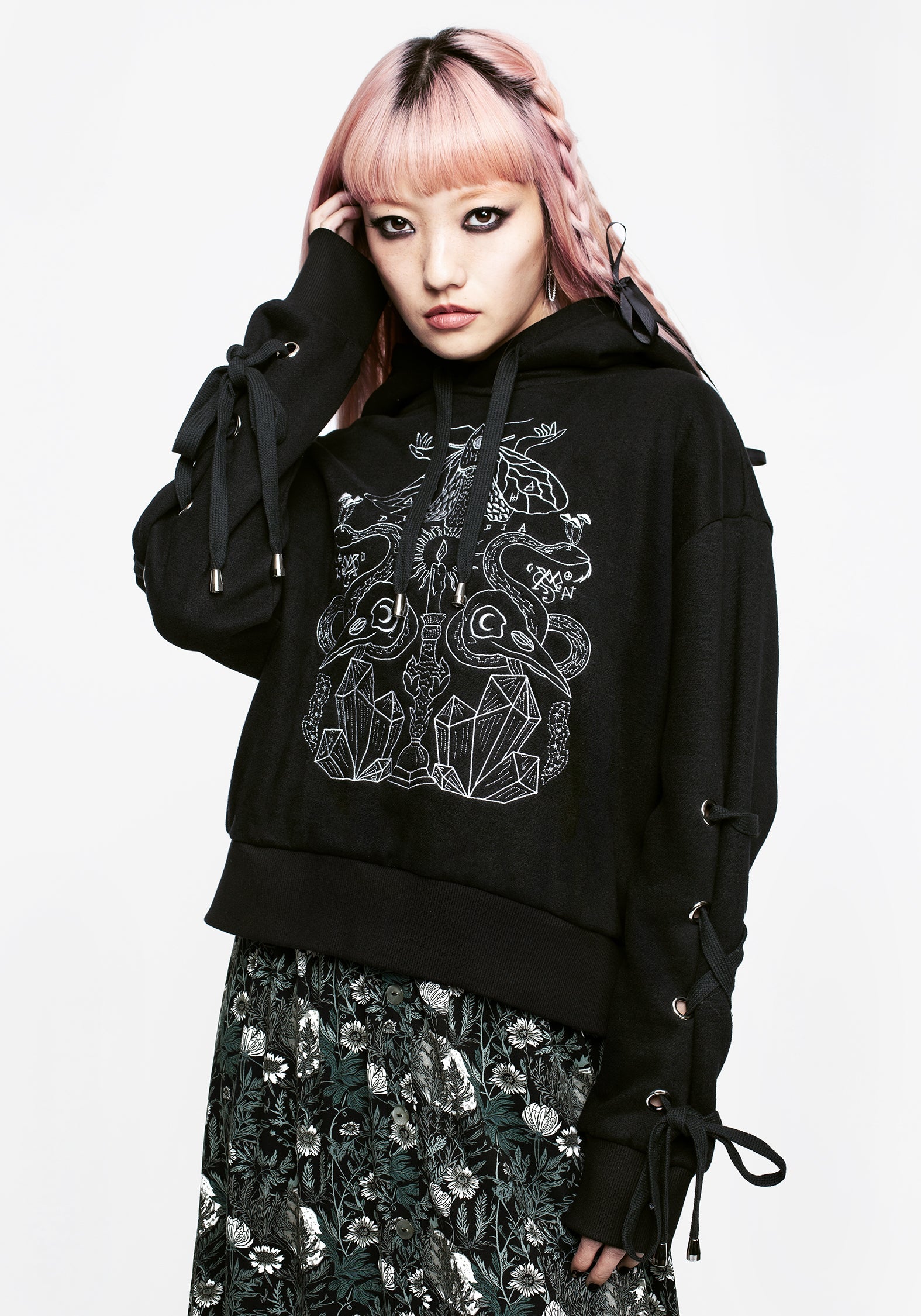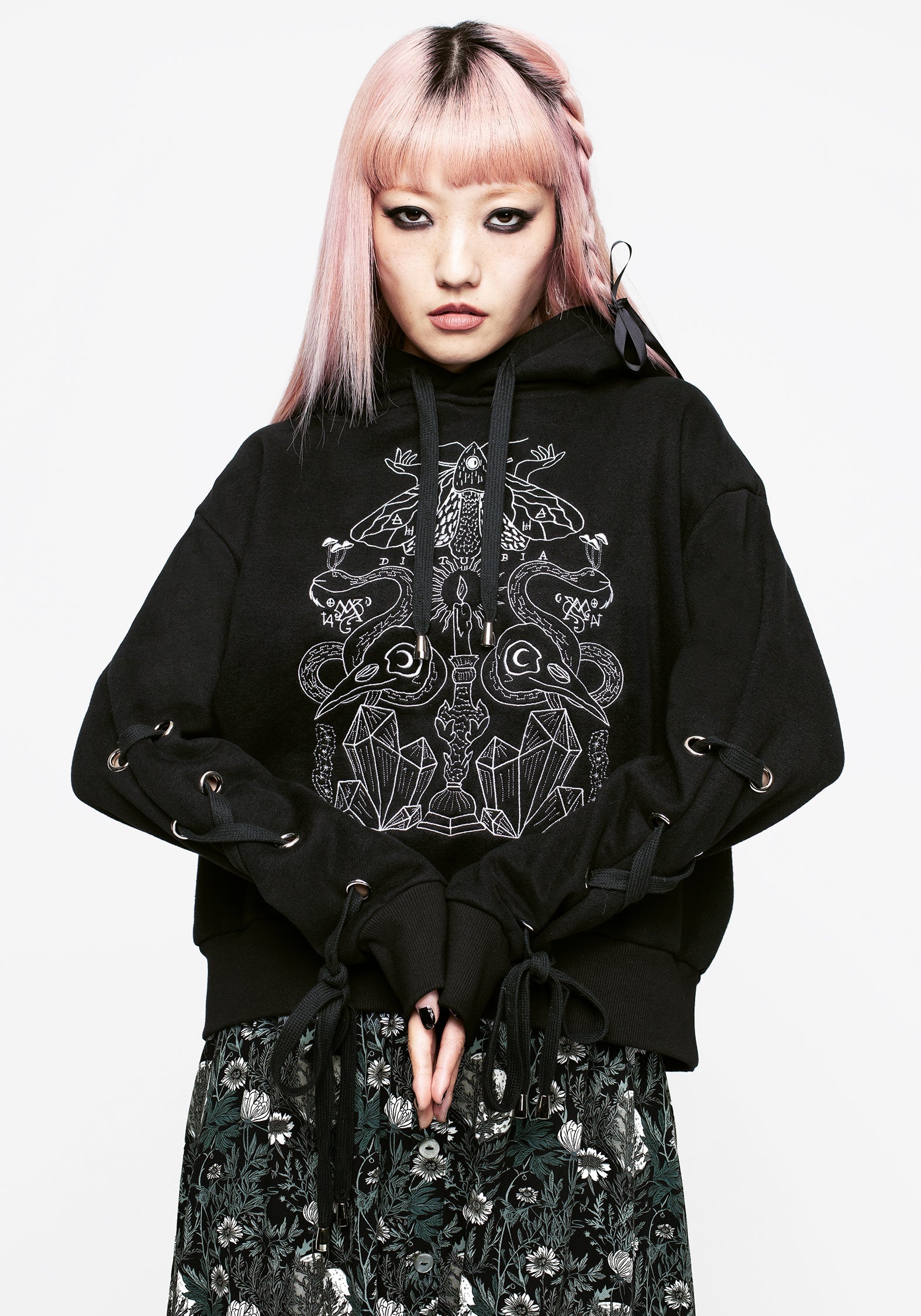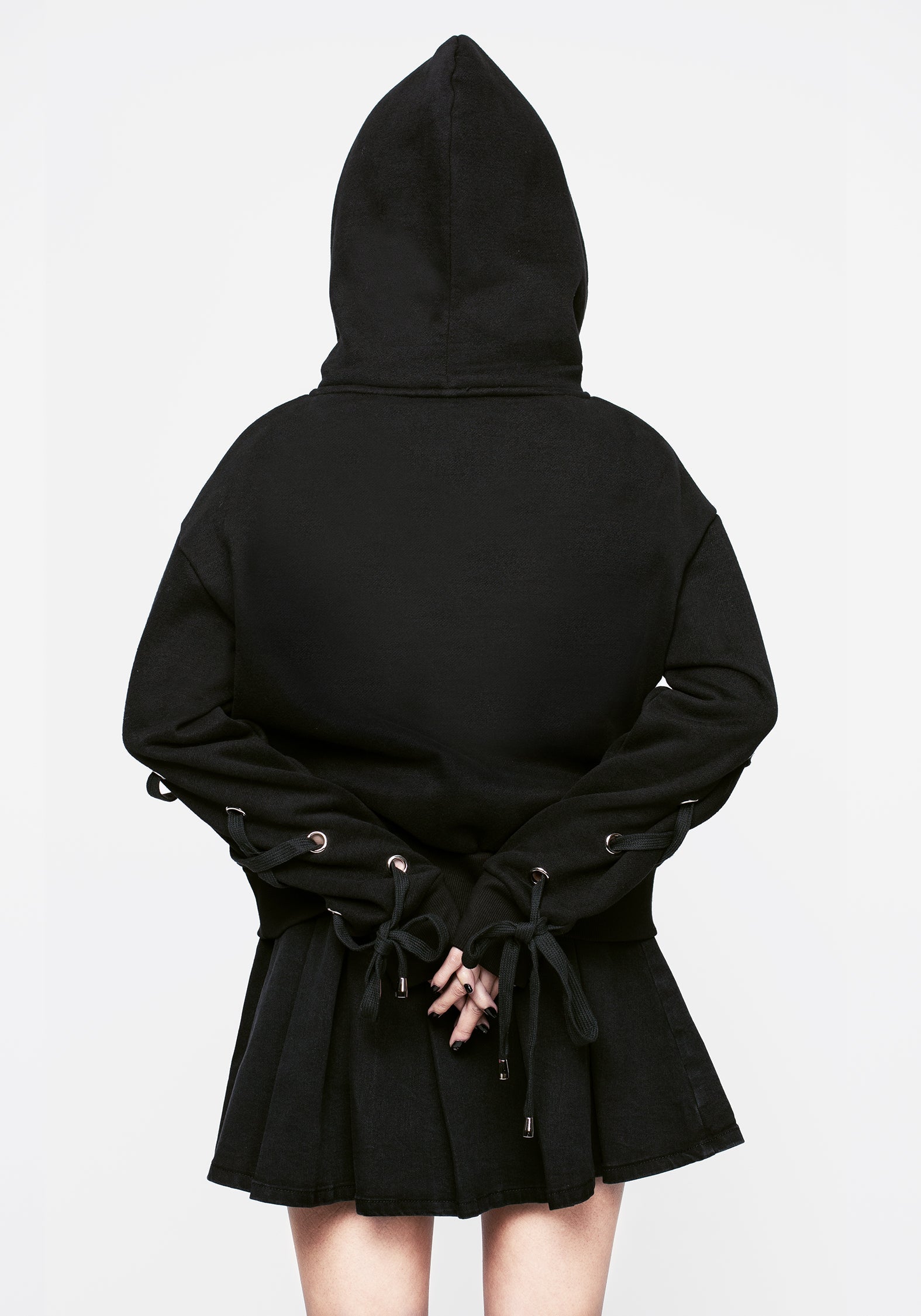 - Comfy long sleeves with lace-up feature (woven cords thread through silver eyelets on forearms)