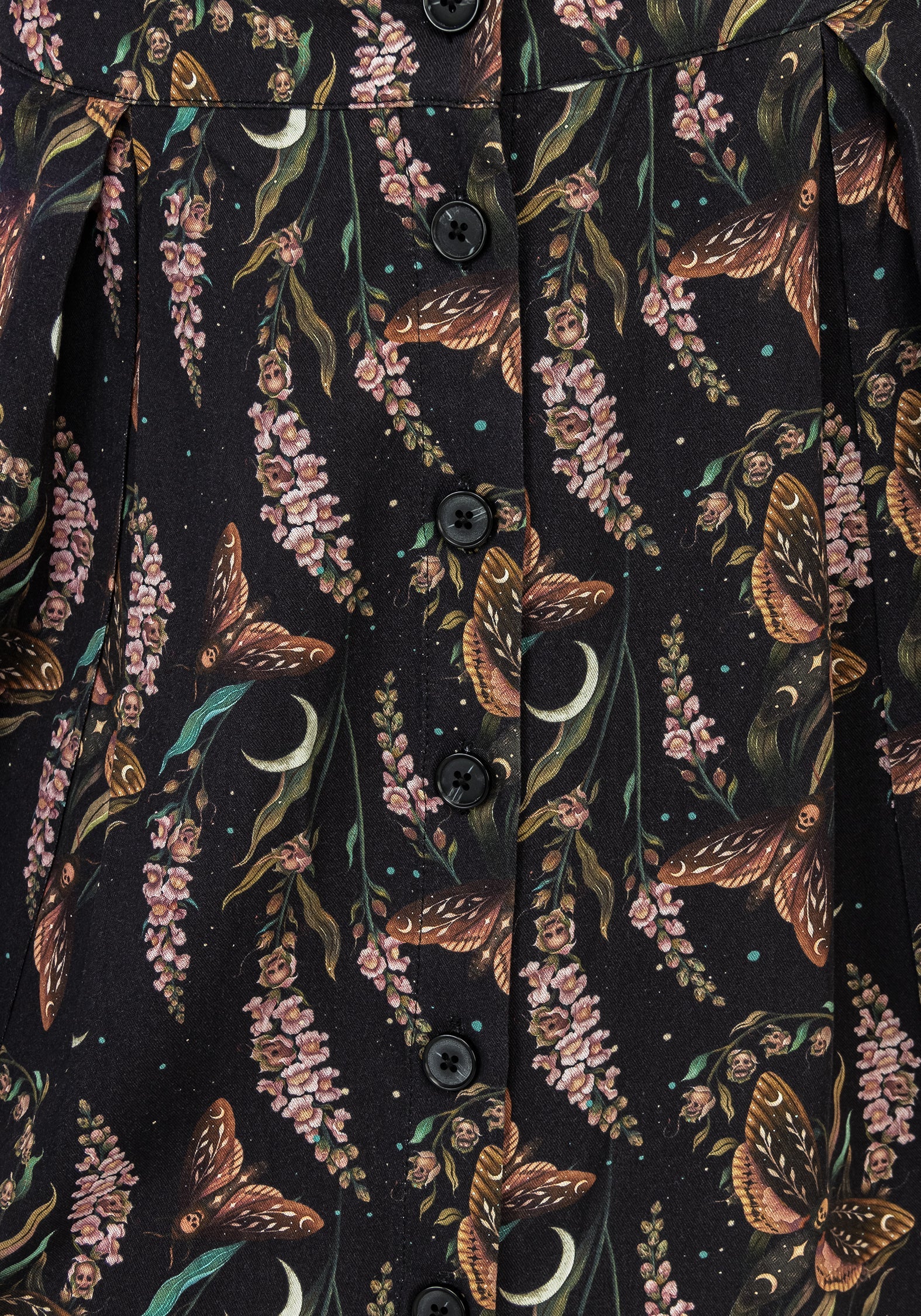 - All-over print features death’s head hawkmoth fluttering between sickle moons & foxgloves