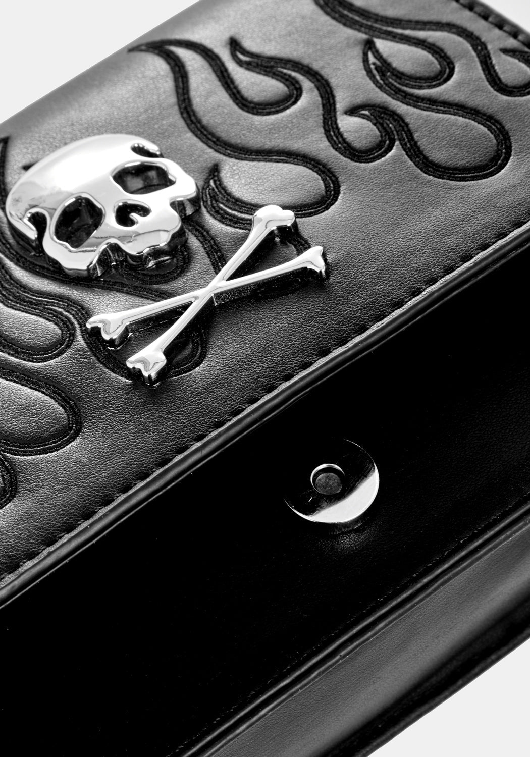 - Bulky skull & crossbones motif with black embroidered flames on front flap (rly reflects your spirit of vengeance)