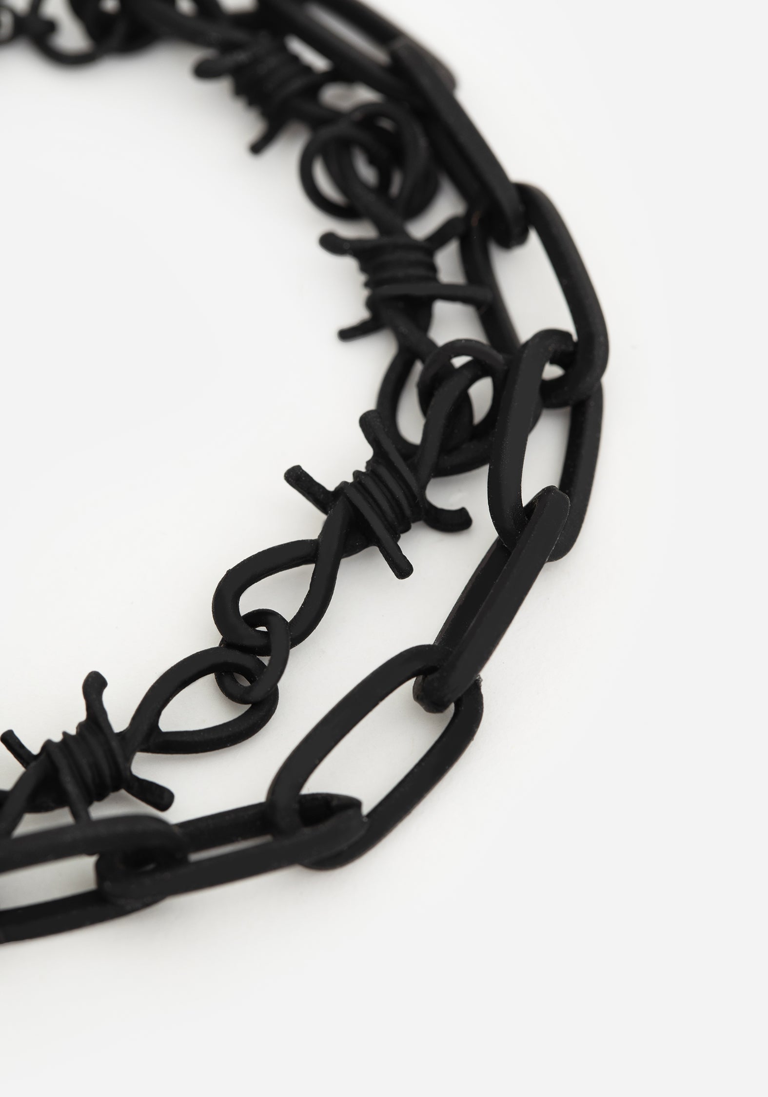 An edgy mixed chain bracelet featuring faux barbed wire, all finished with a smooth, matte black rubberised coating.