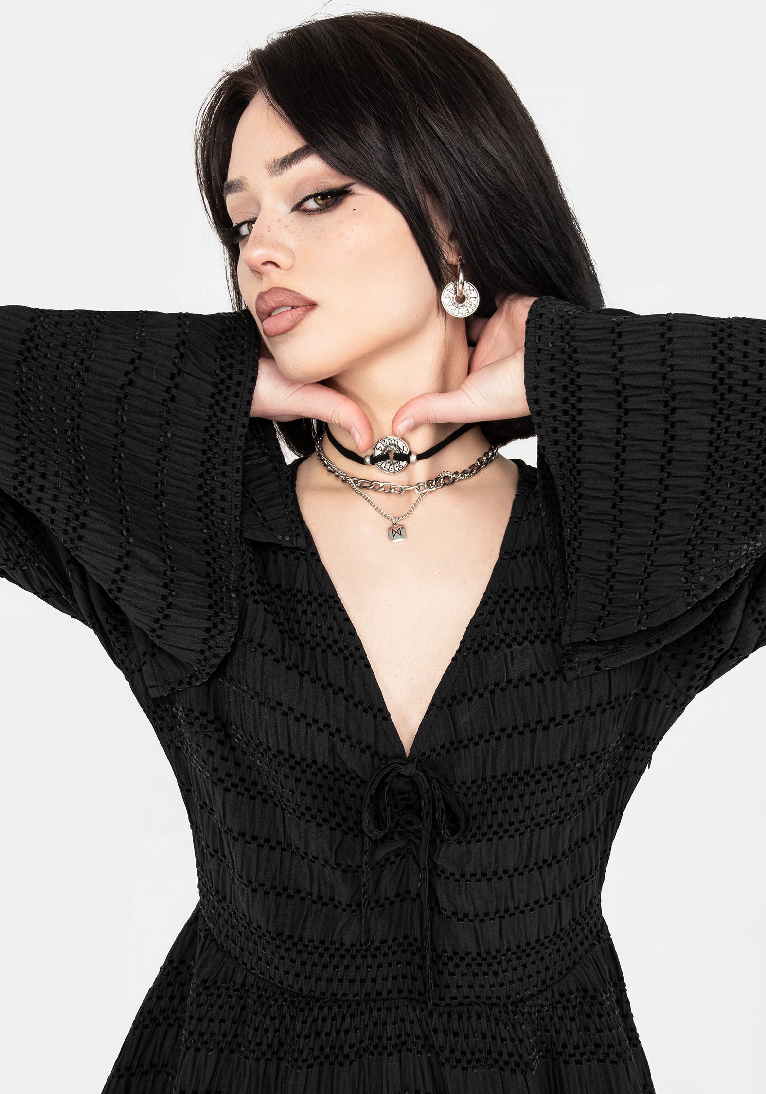 - Black crinkle fabric with velour thread running stitch in irregular stripes to add dimension