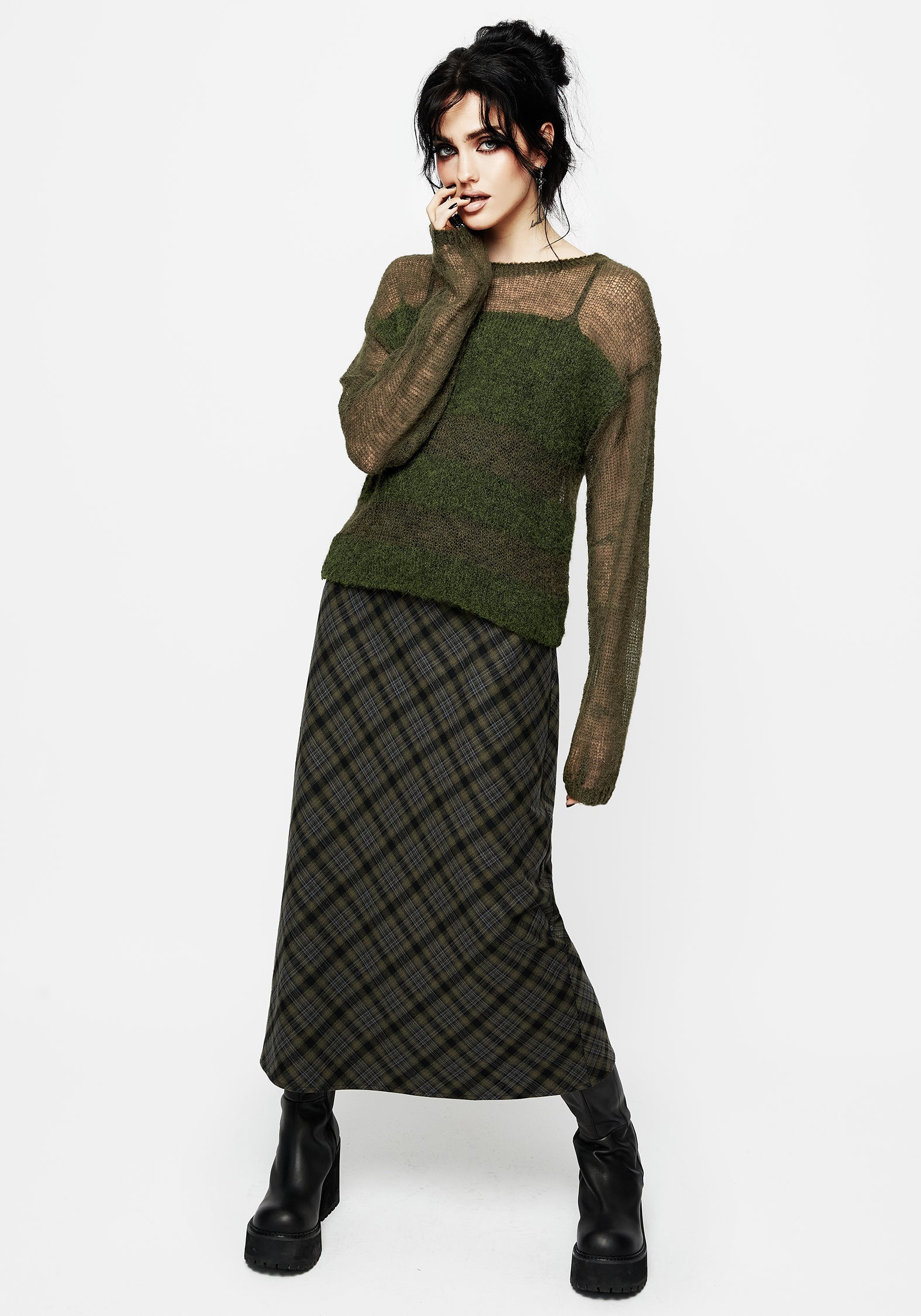 - Earthy green fabrication for grungy nature-inspired styling