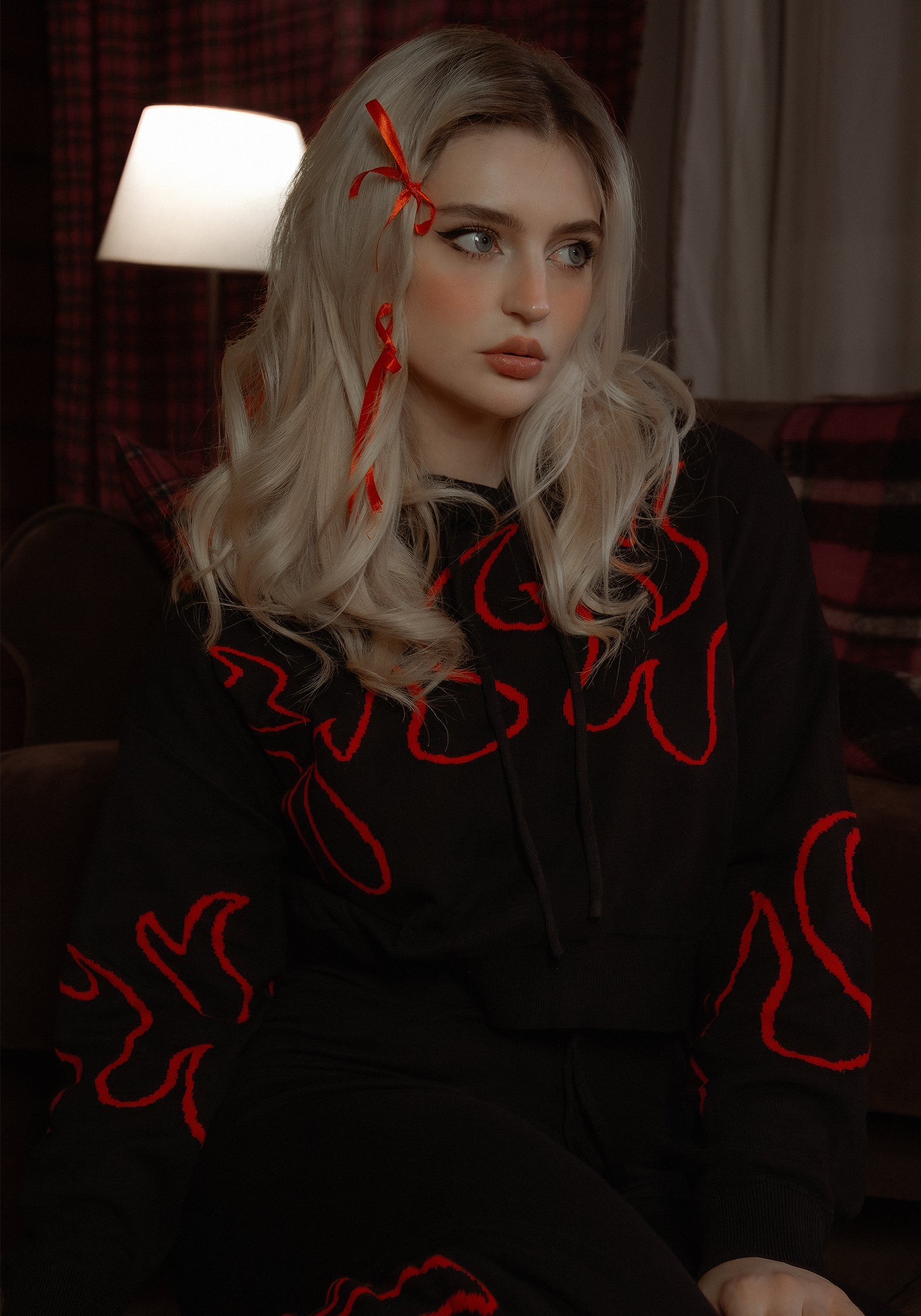 - Black knit crop hoody with red flame motif
