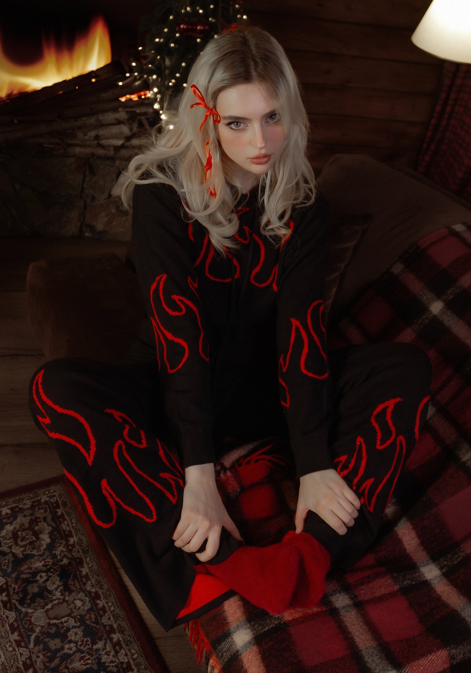- Intarsia knit fabrication for an intricate flame design on legs without the bulk (also gives a fantastic contrasting red interior)