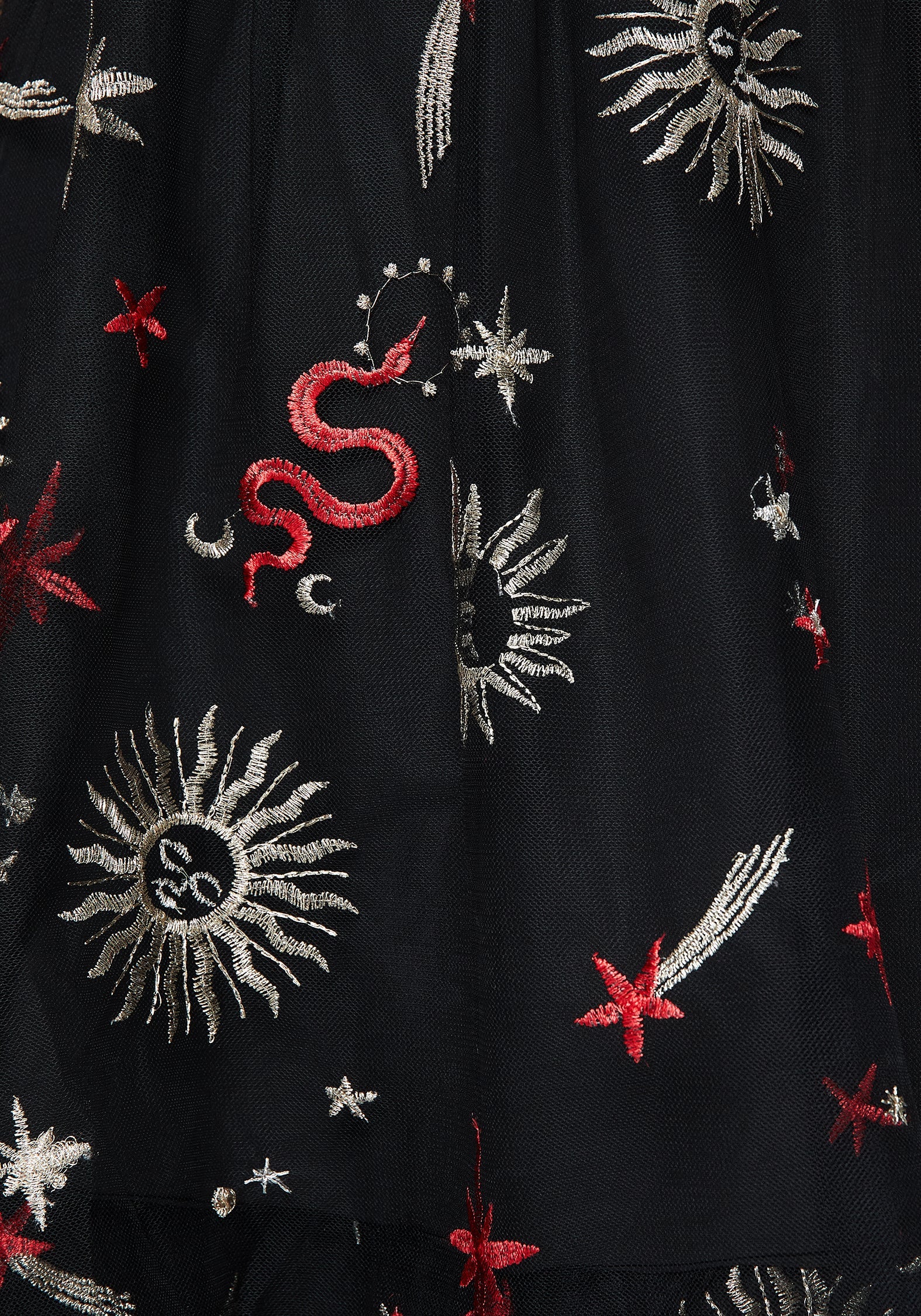 - Red & metallic all-over embroidery features hearts, suns, snakes, spiders & stars
