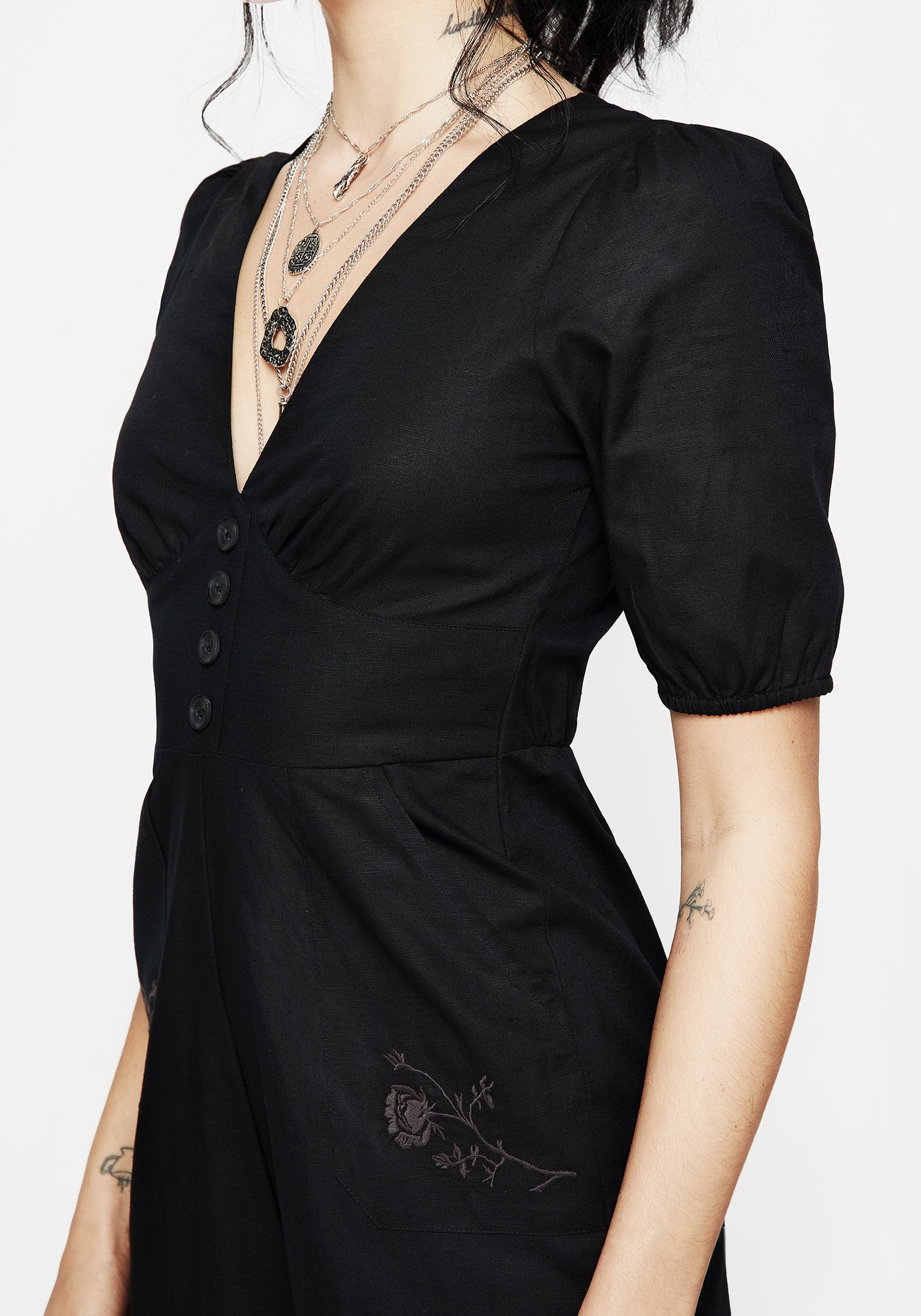 - Fitted bodice flows from gathered waistband into wide, roomy legs