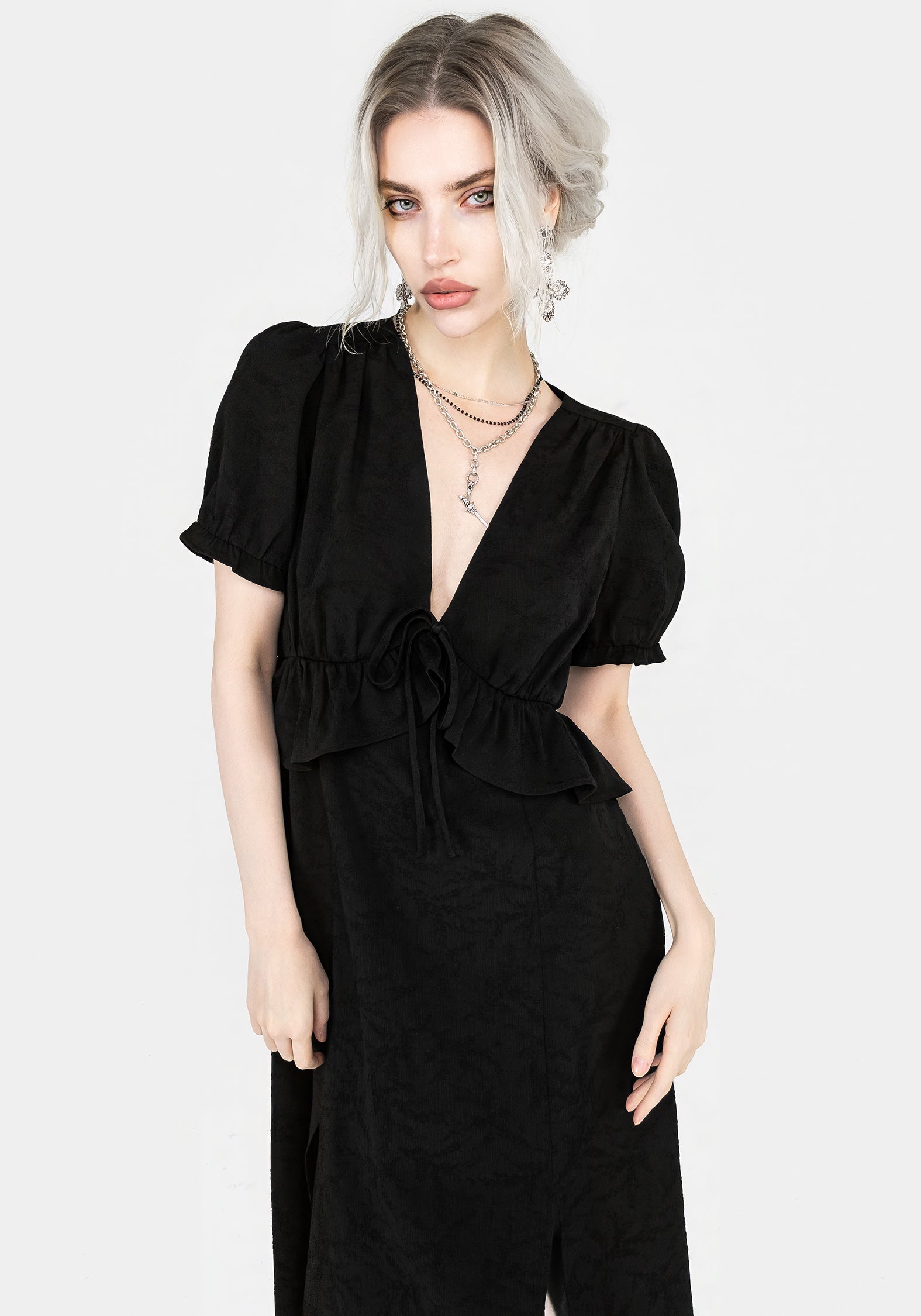 - Plunging V-neckline with self-fabric bow & romantic frill-cuffed short puff sleeves