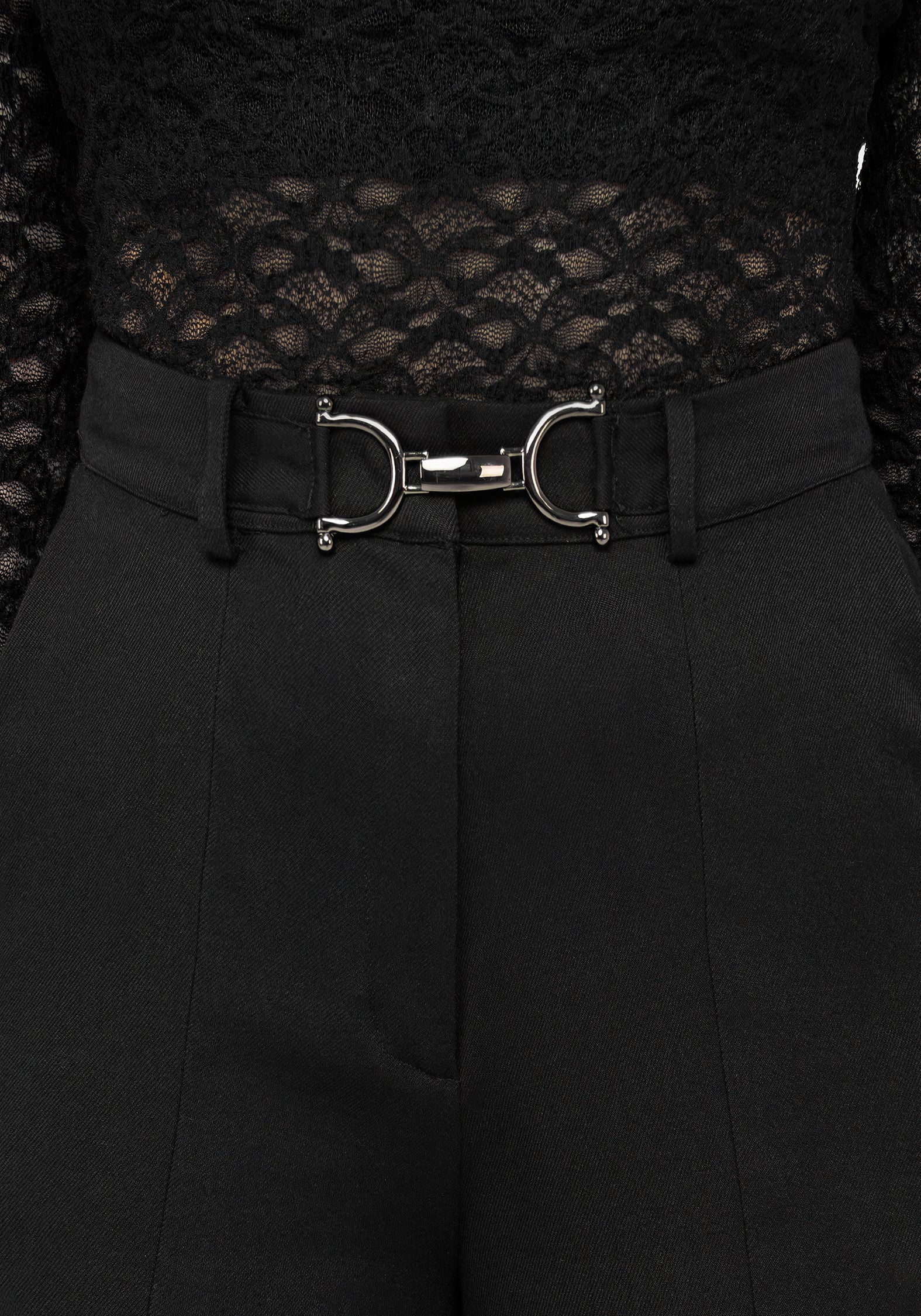 - Silver horse bit buckle secures & adorns a button & zipper fly