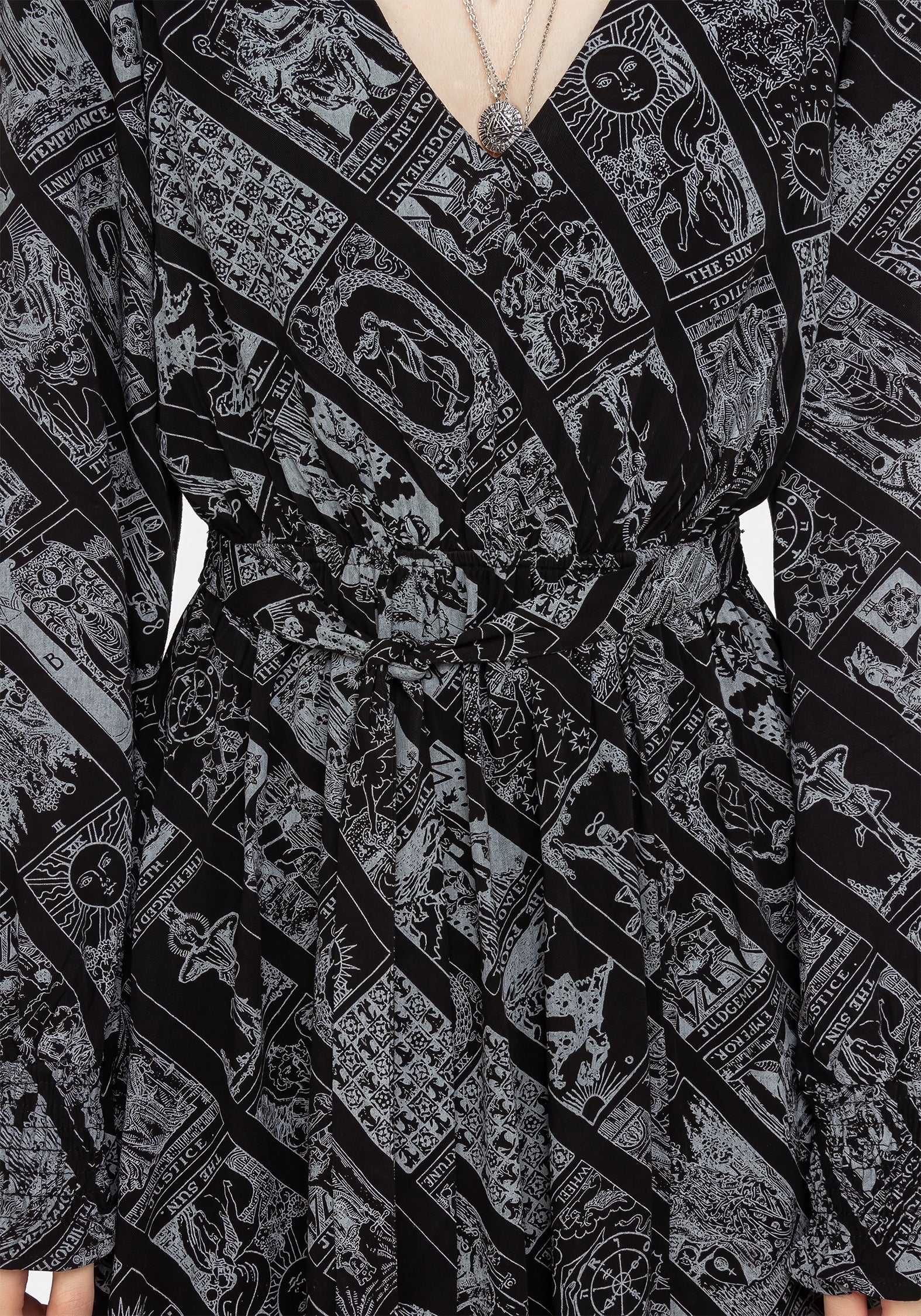 - Silky breathable fabrication with all-over tarot print (non-stretch)