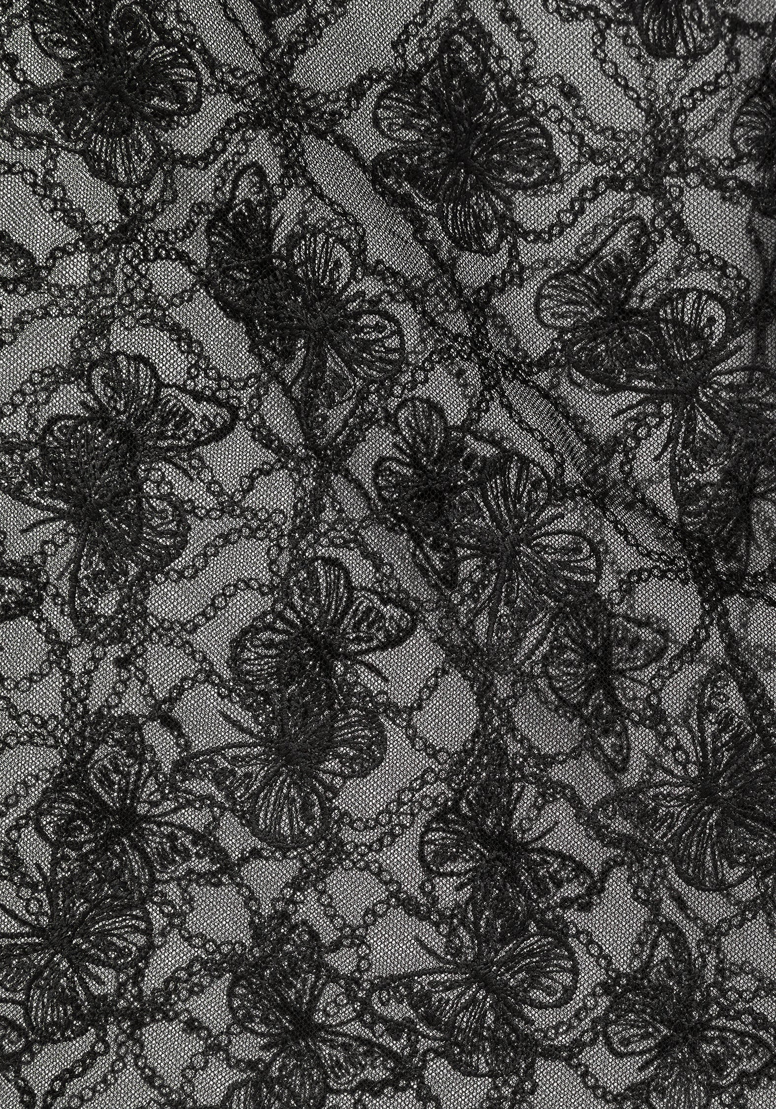 - Sheer black butterfly embroidered tulle fabric is voluminous & ornate