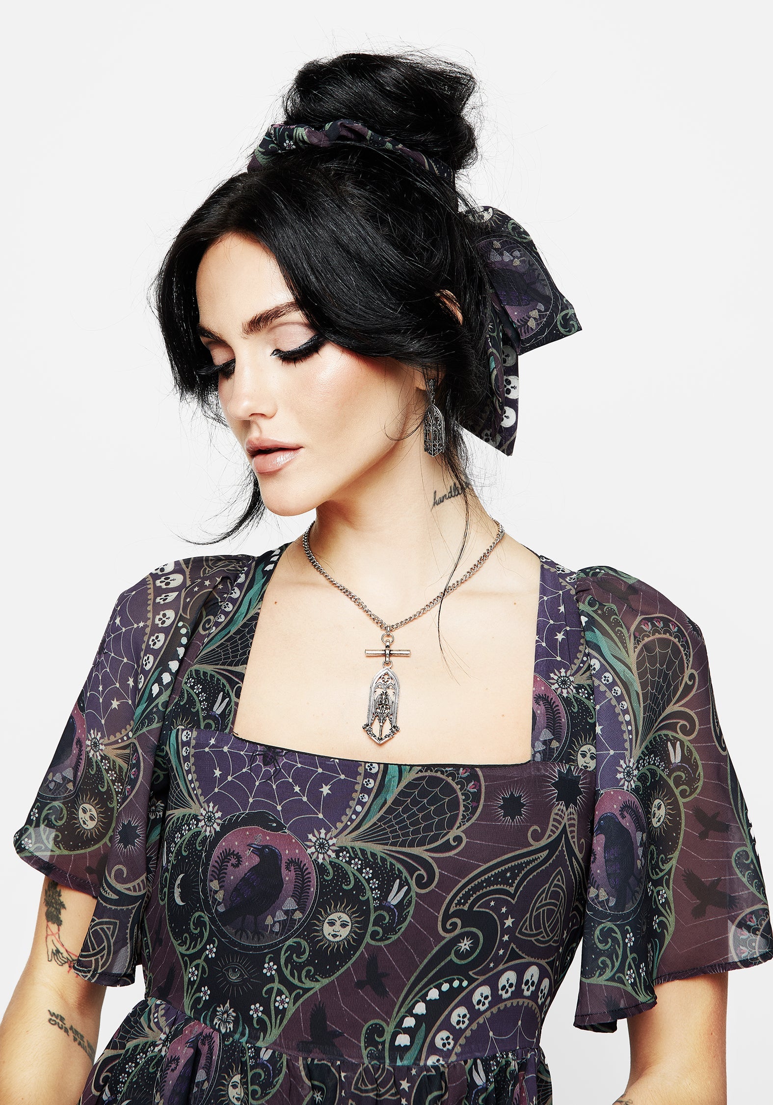- Floaty sheer chiffon fabric with an all-over gothic print on a purple background (features ravens, spiderwebs & skulls)