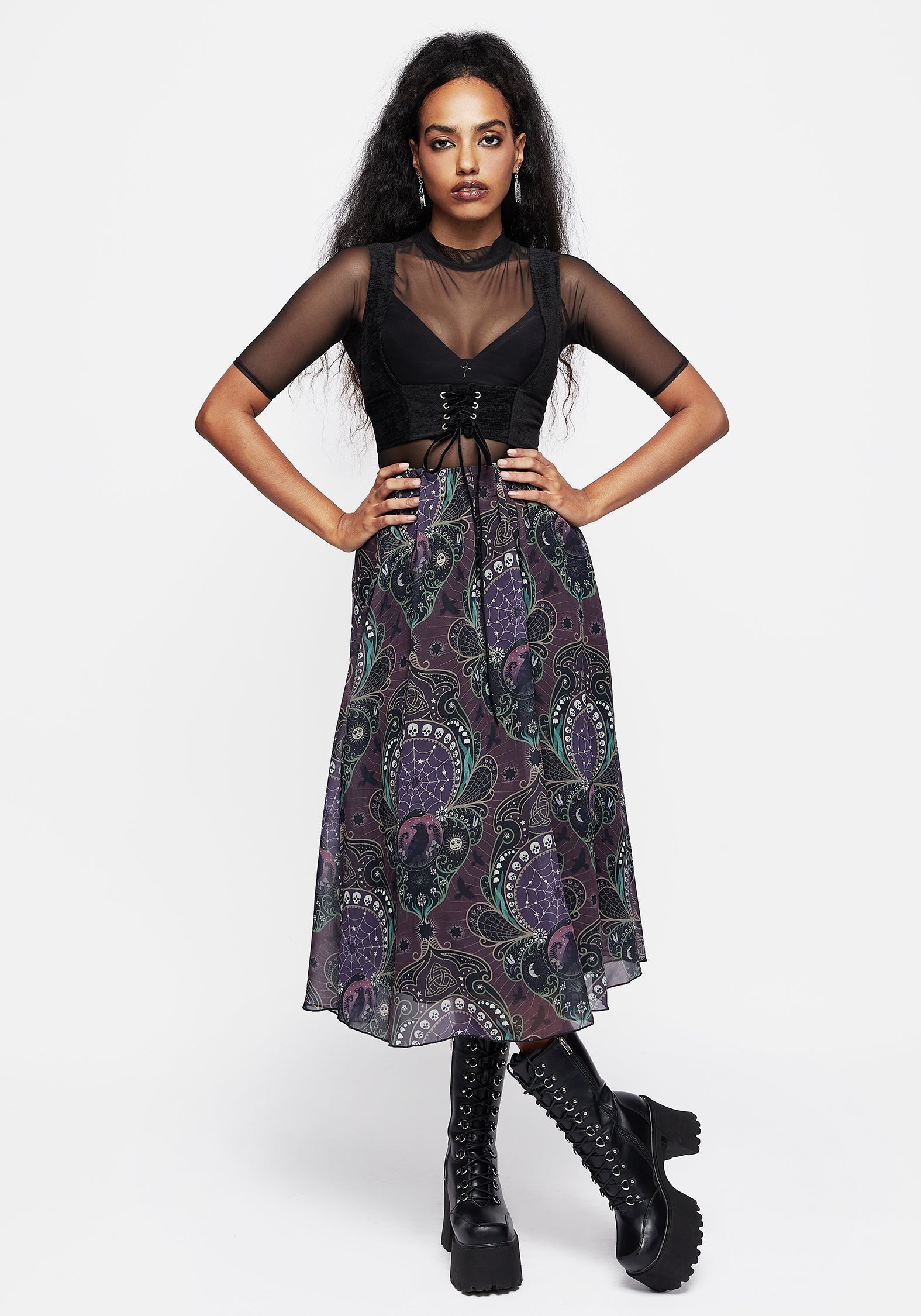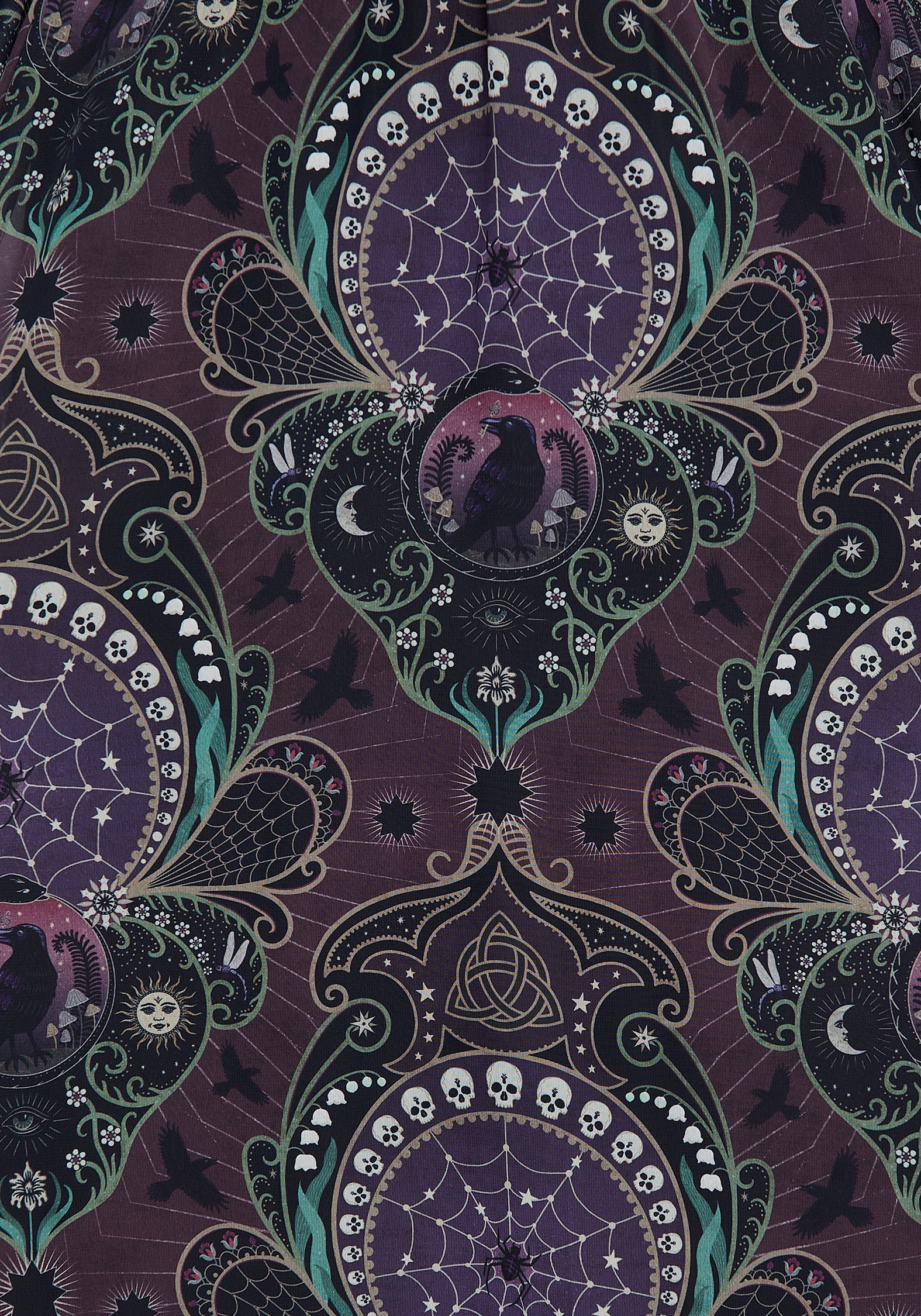 - All-over gothic print on a purple background (features ravens, spiderwebs & skulls)