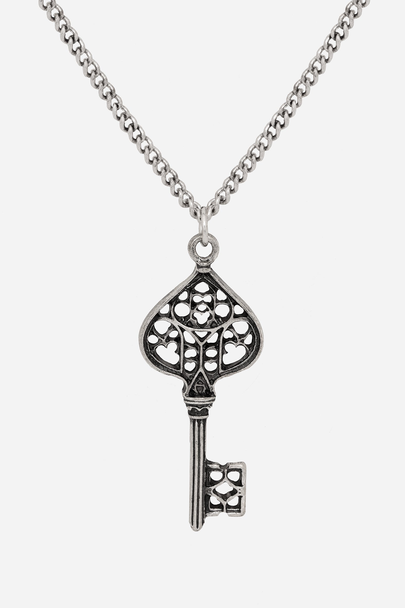 Unlock a new obsession with this gothic key layered necklace. A dainty cable choker, chunky links, & traditional curb chain stack to create a classic layered look. An ornate antique-effect silver gothic key pendant hangs from its longest length, while a Gothic inspired charm punctuates the choker. A statement jewellery piece perfect for lovers of Gothic architecture & design!