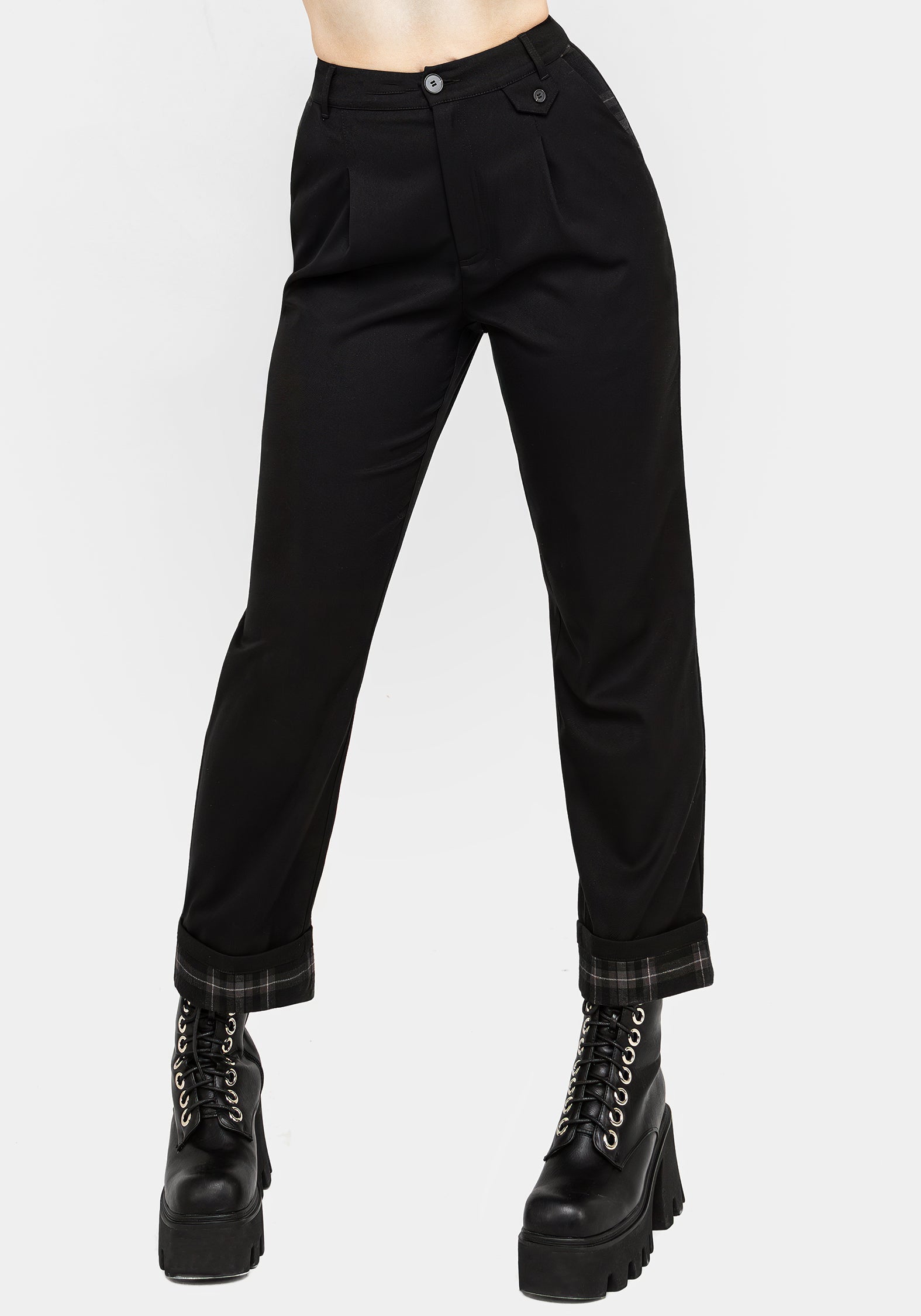 - Black tailored trousers with contrasting check turn-ups