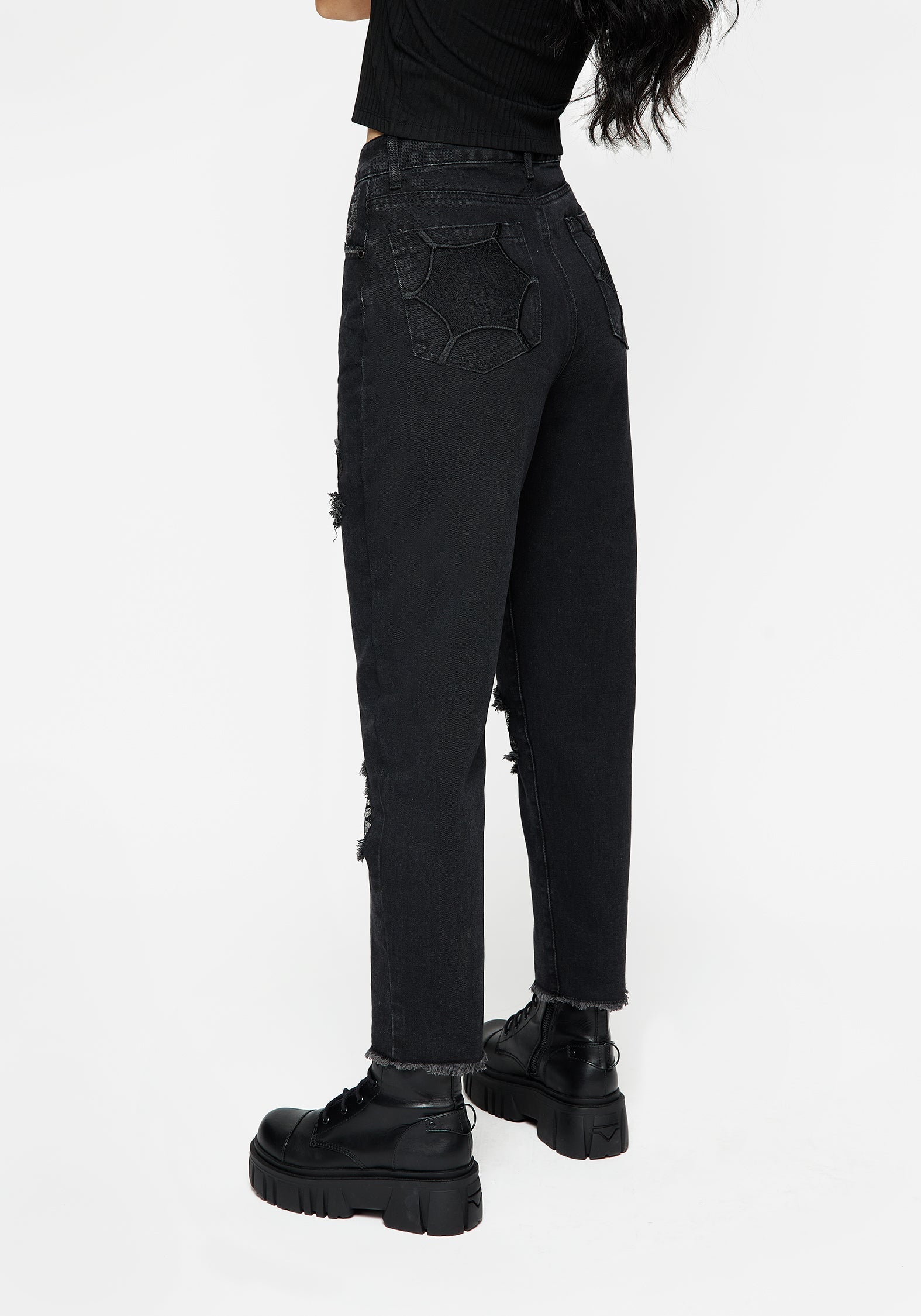 - Cut-outs with ripped effect on legs & back pockets lined out with cobweb lace to fill the space