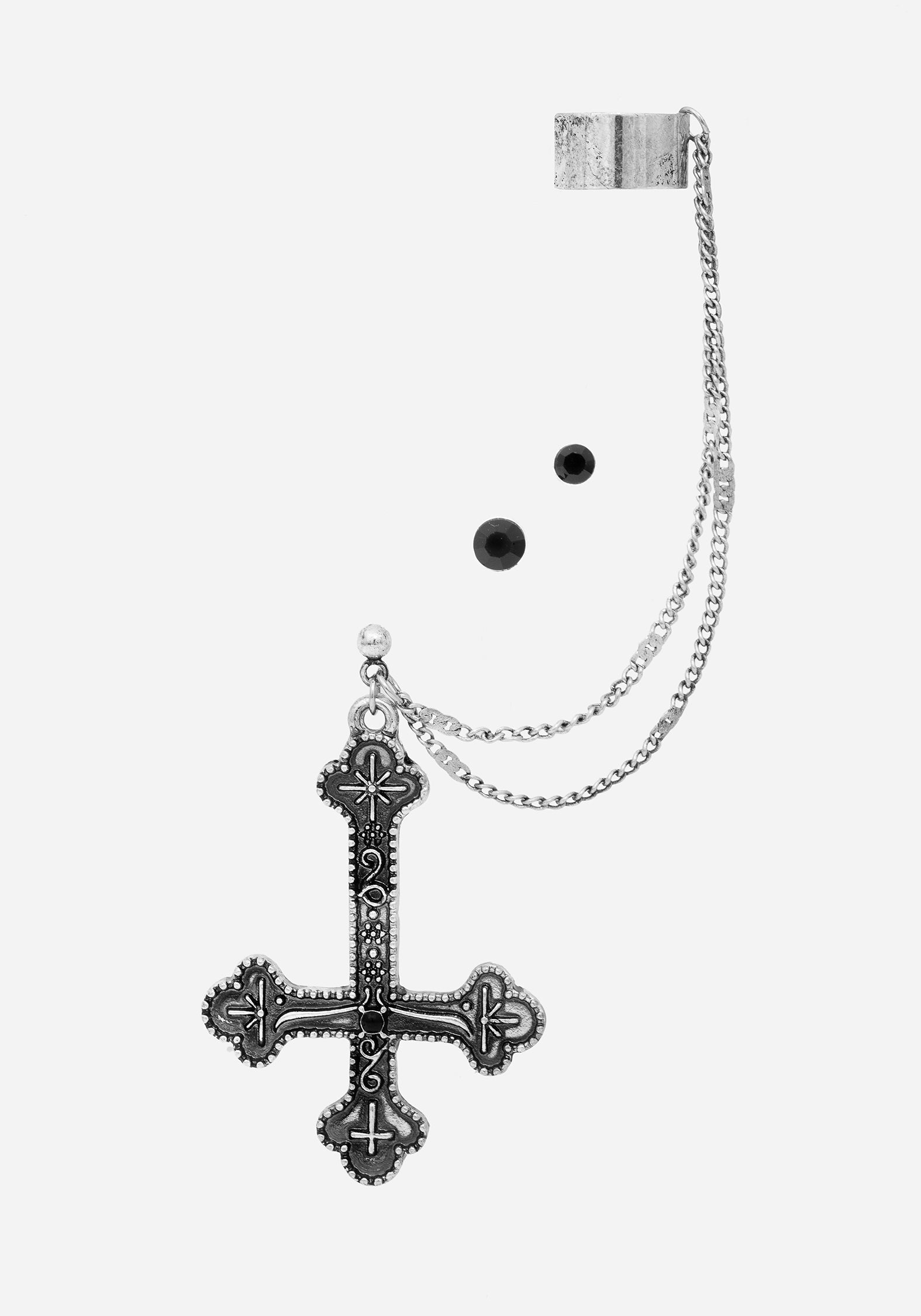 Let’s get to the crux of the matter, shall we? You need a no-nonsense new earring set that does all the stylin’ for you. This cuff earring set includes a silver cuff with an ornate inverted cross drop earring, linked by two dainty draping chains. Add a couple of black gemstone studs and you have the perfect set for lobes with multiple piercings. Wear them all on one side (if you have up to three piercings) or mix ‘n’ match with pieces from your own collection to curate a unique look.