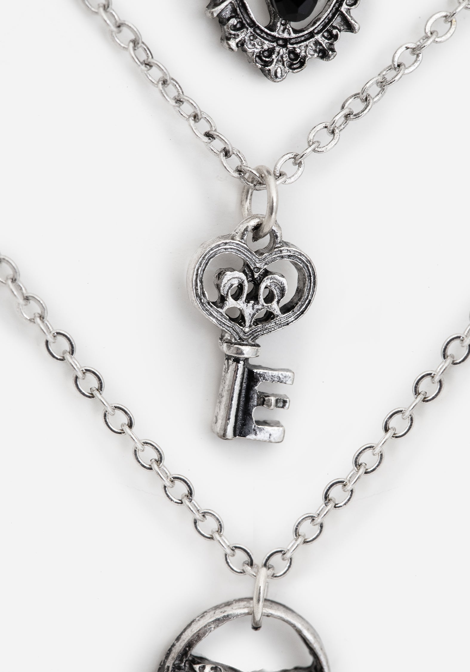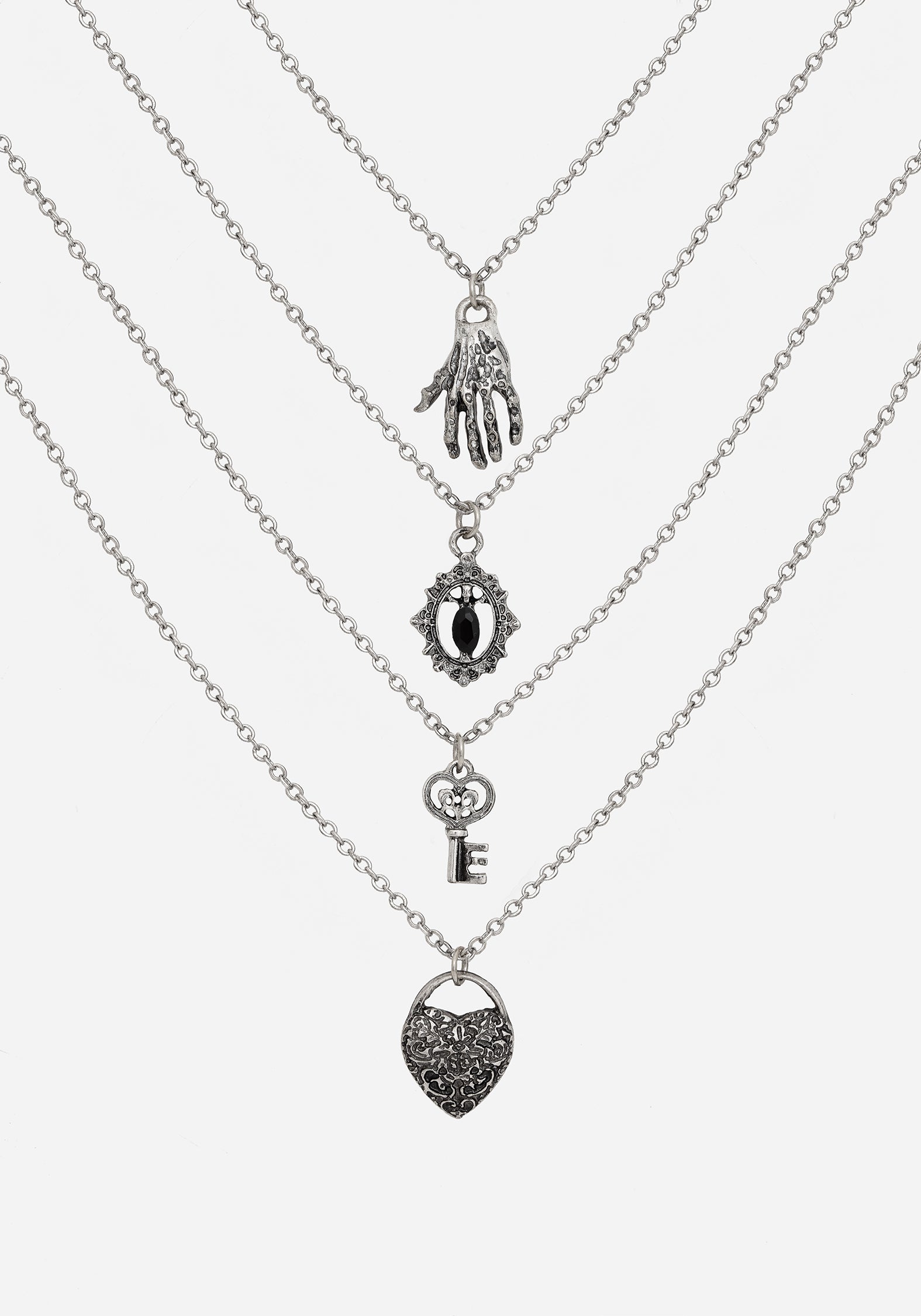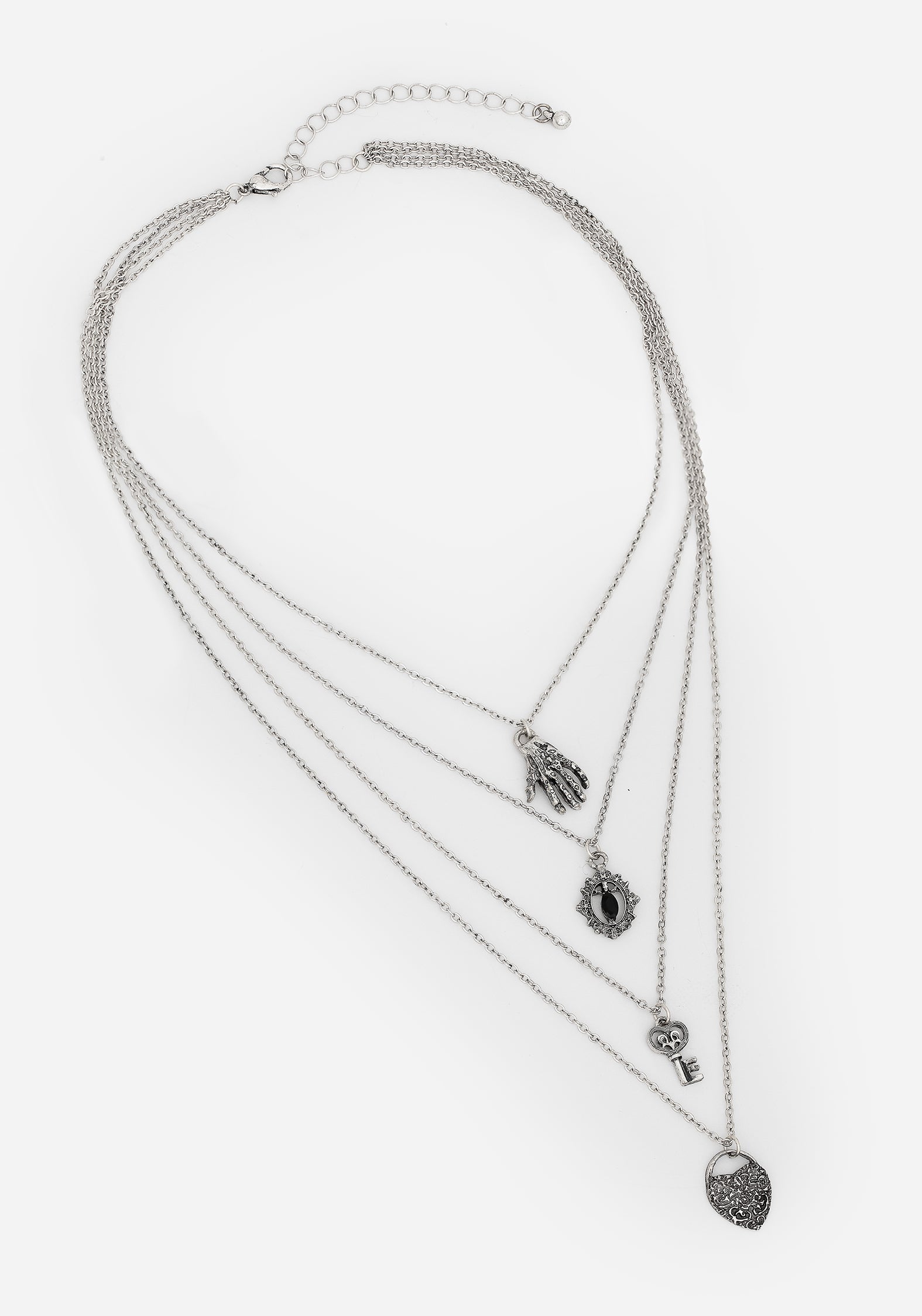 Curiouser & curiouser... A delicate layered chain necklace featuring four dainty charms with intriguing & mystical connotations: a skeletal hand, a picture frame, a key, a heart padlock. The thin curb link chain adds fluidity & motion to this keepsake.