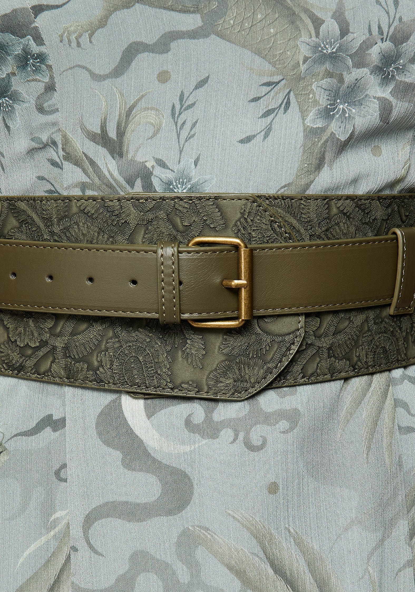 - Green floral debossed faux leather layered waist belt