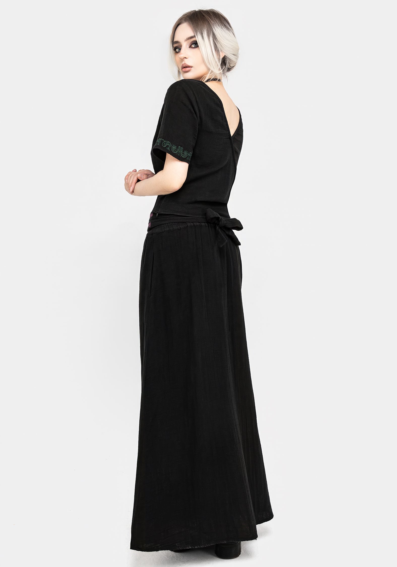 - Forest green Celtic-inspired floral embroidery wraps around sleeve cuffs