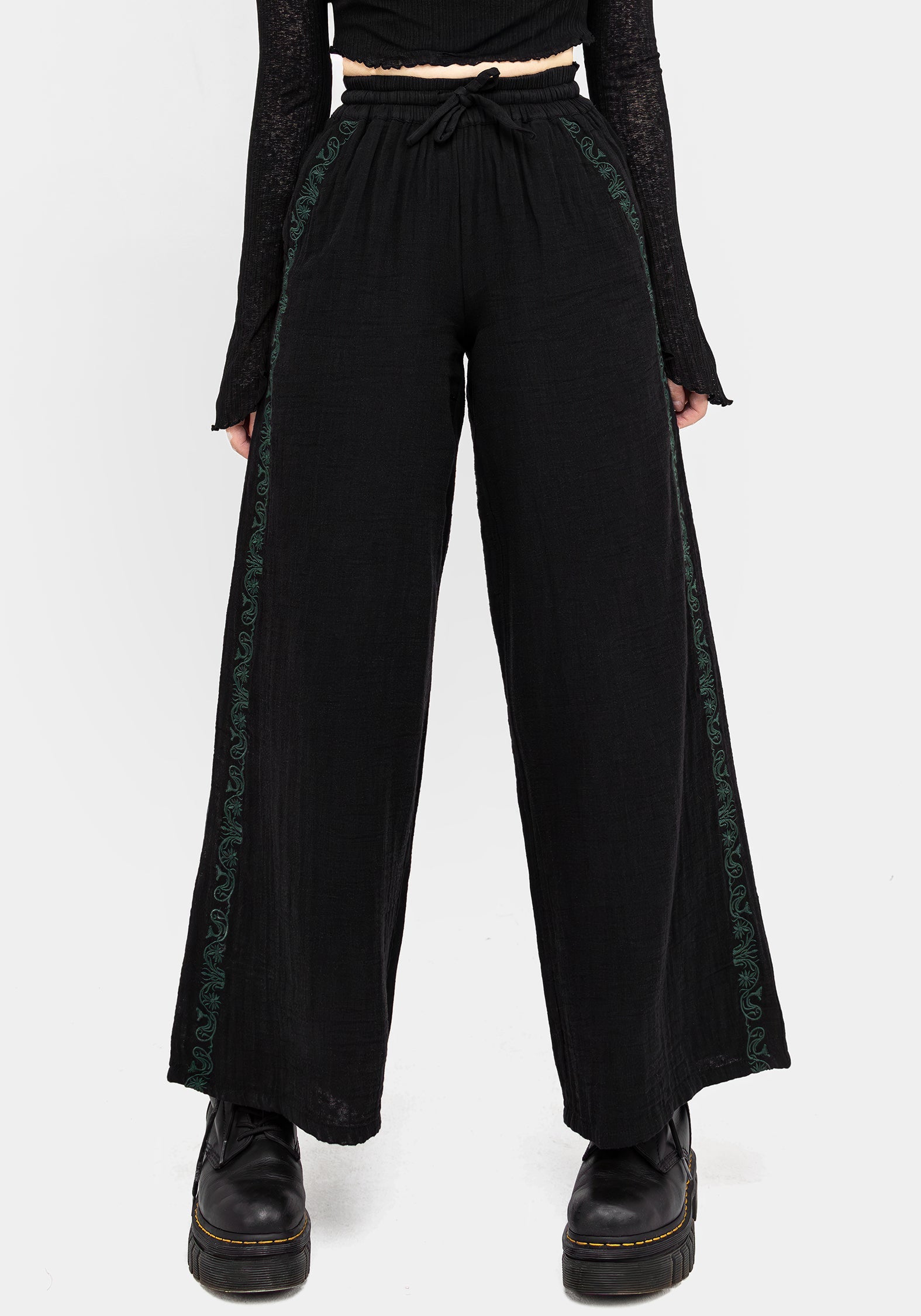 - Forest green Celtic-inspired floral embroidery follows side seams