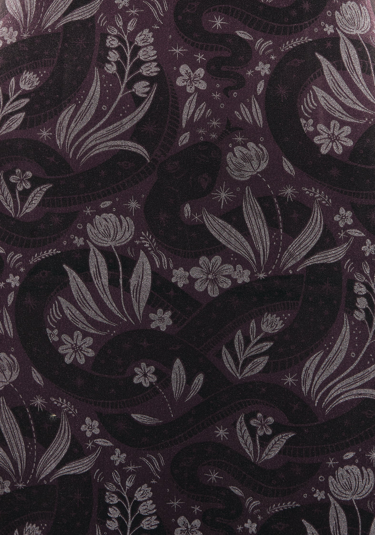 - Rich burgundy velour with an all-over foiled floral serpent print