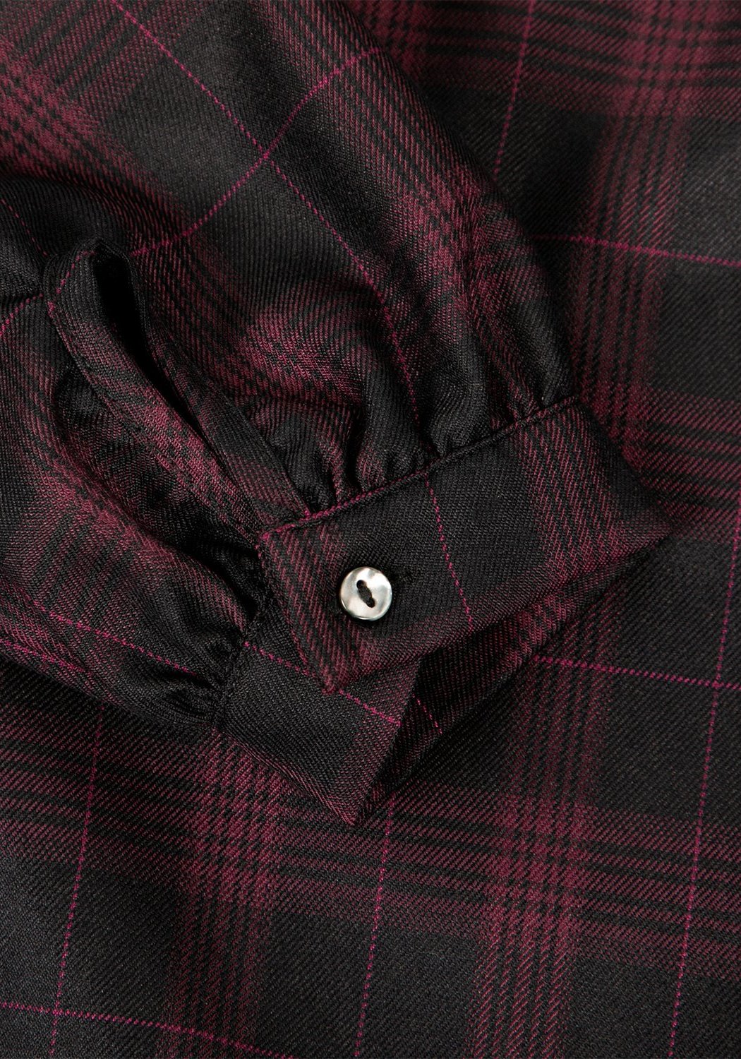 ❦ Wide sleeves have tailored cuffs for feminine cut, finished with pearlescent-buttoned keyhole cuffs