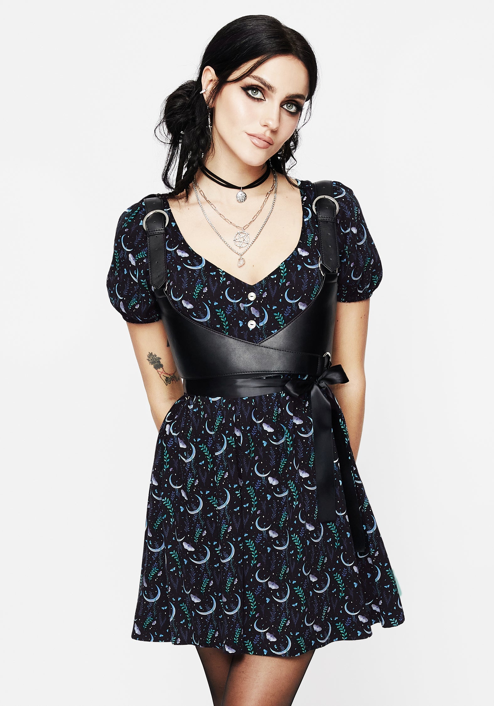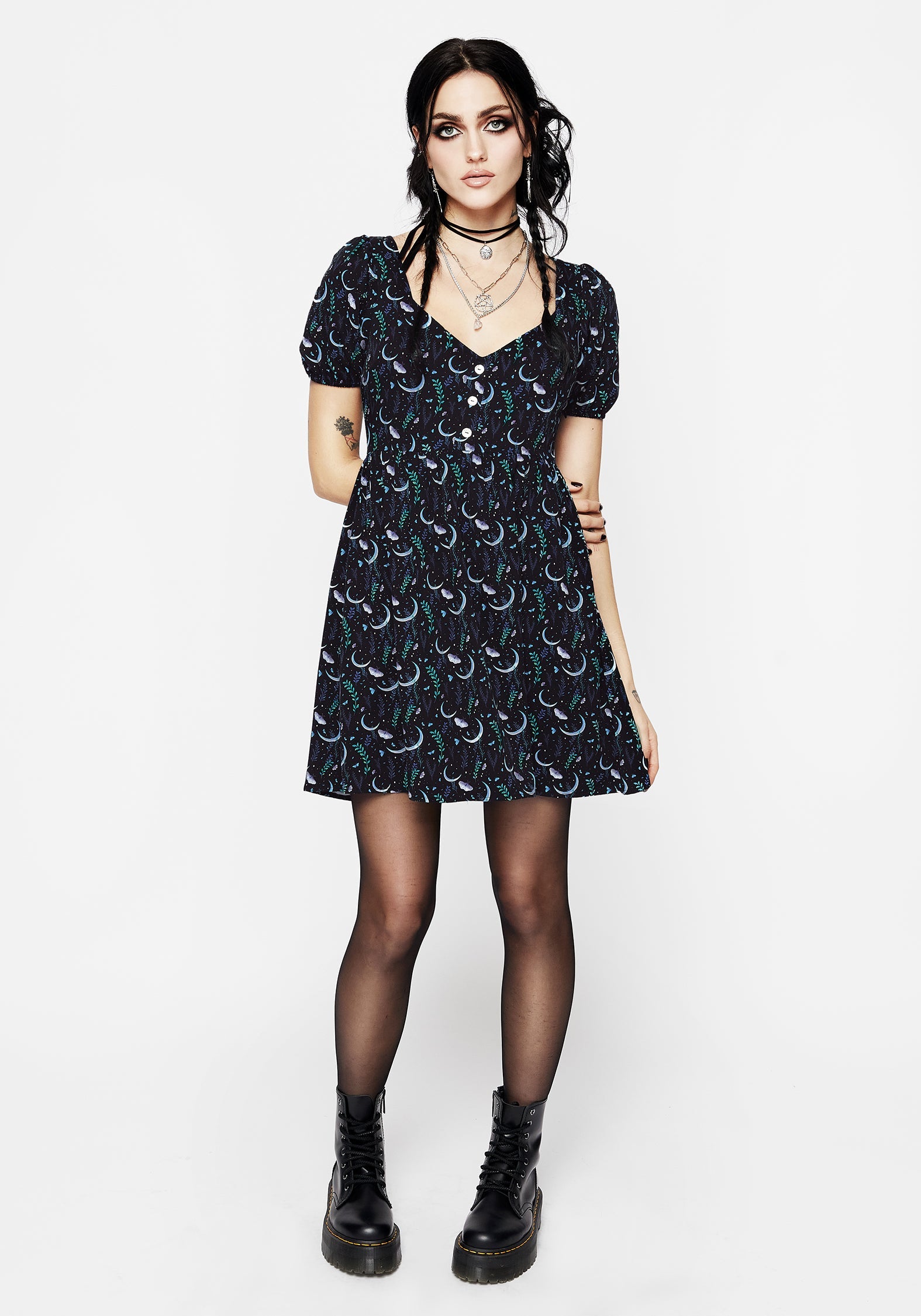 - Black moth & moon print button detail mini dress