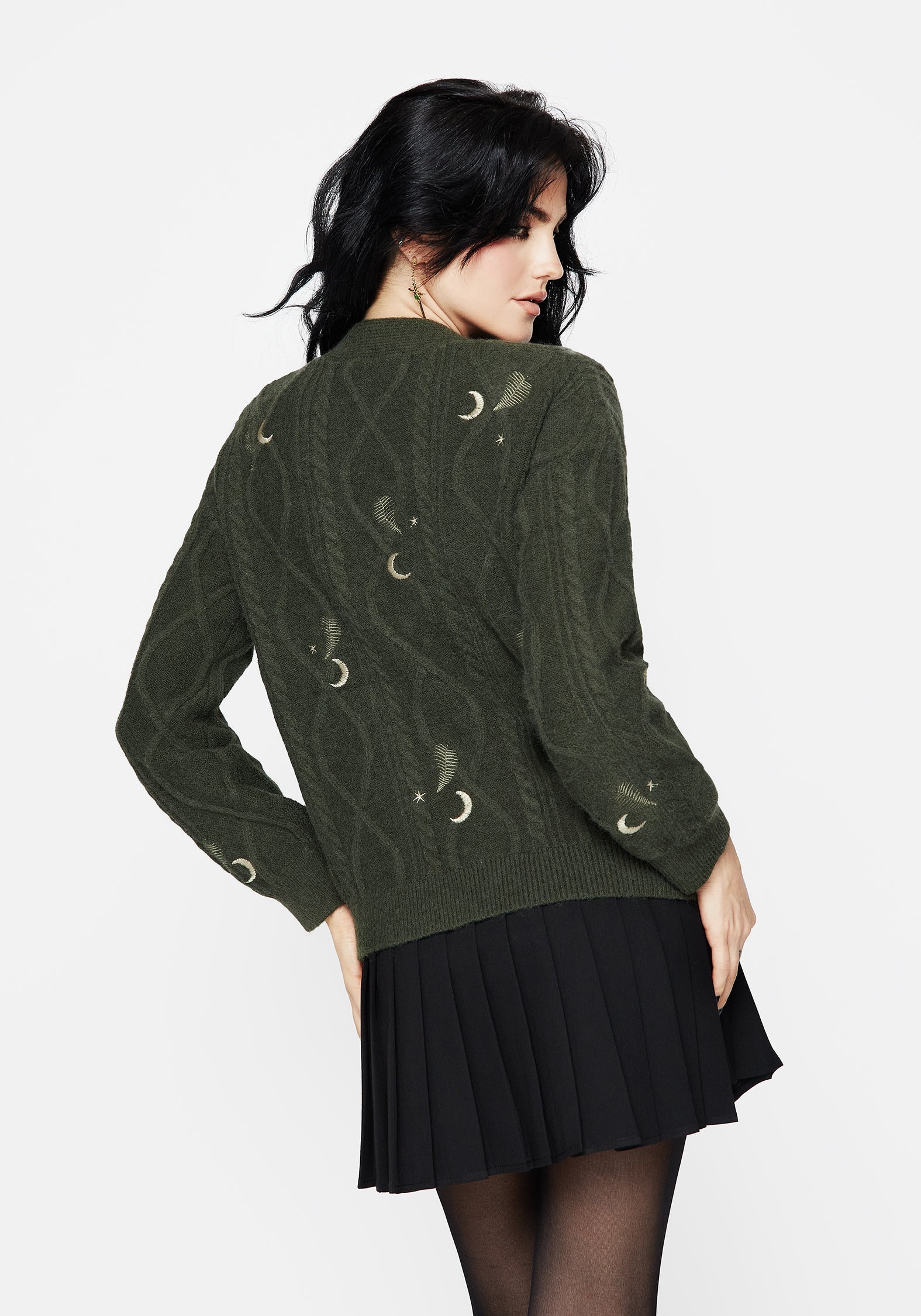 - Cable knit green fabrication dotted with crescent moons & fern fronds