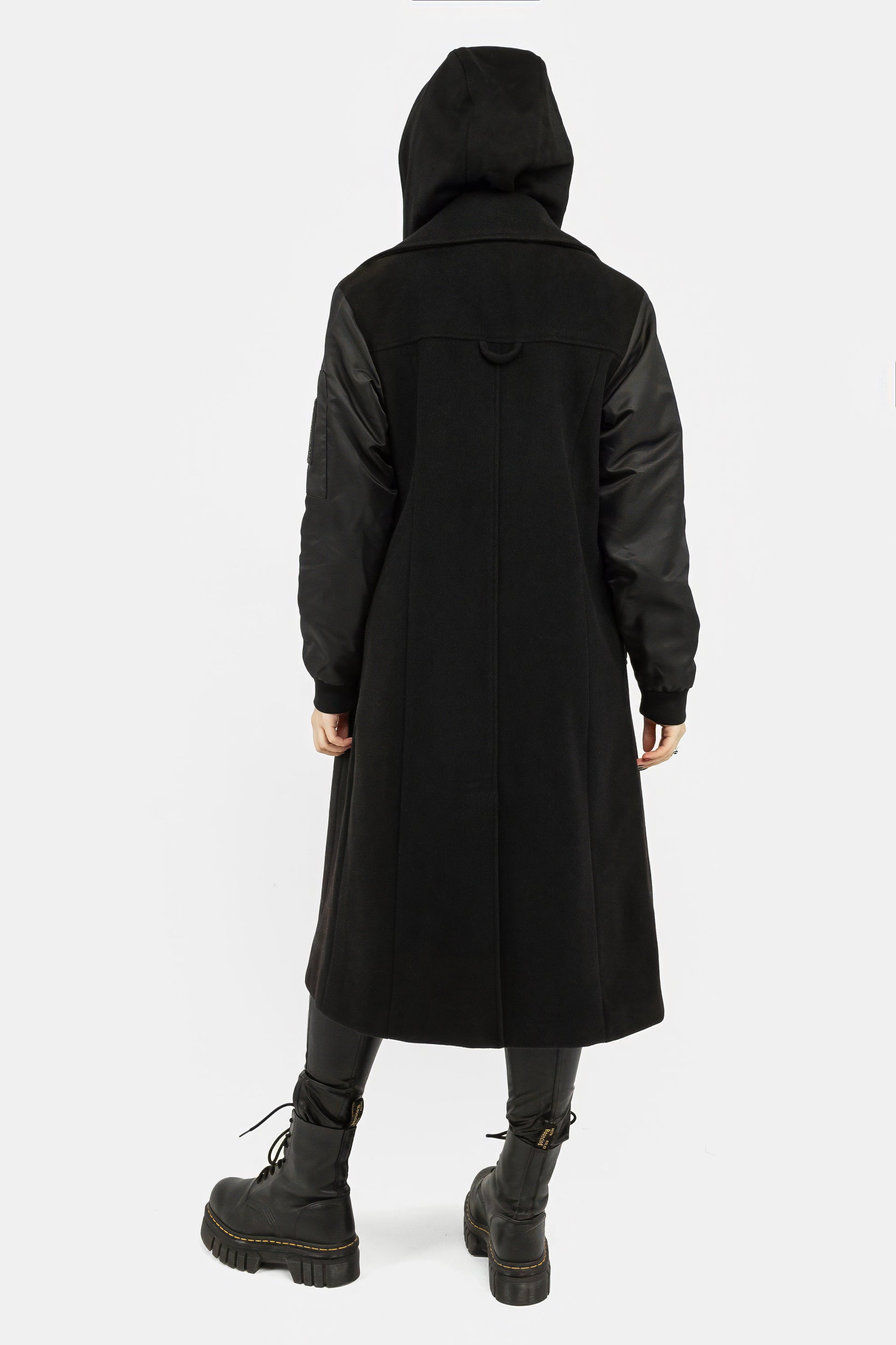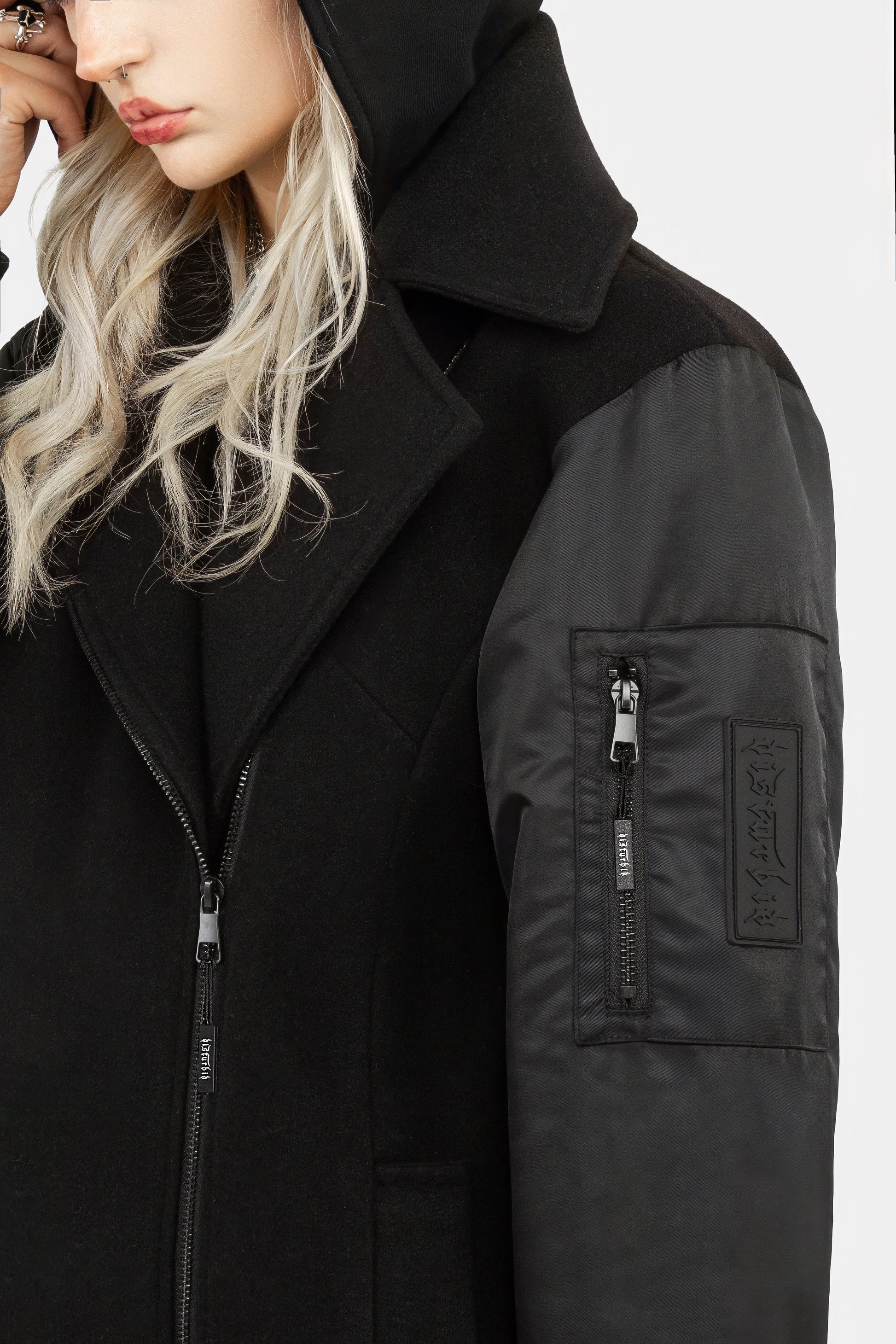 - Wide lapels conceals press studs to secure detachable cotton jersey hood