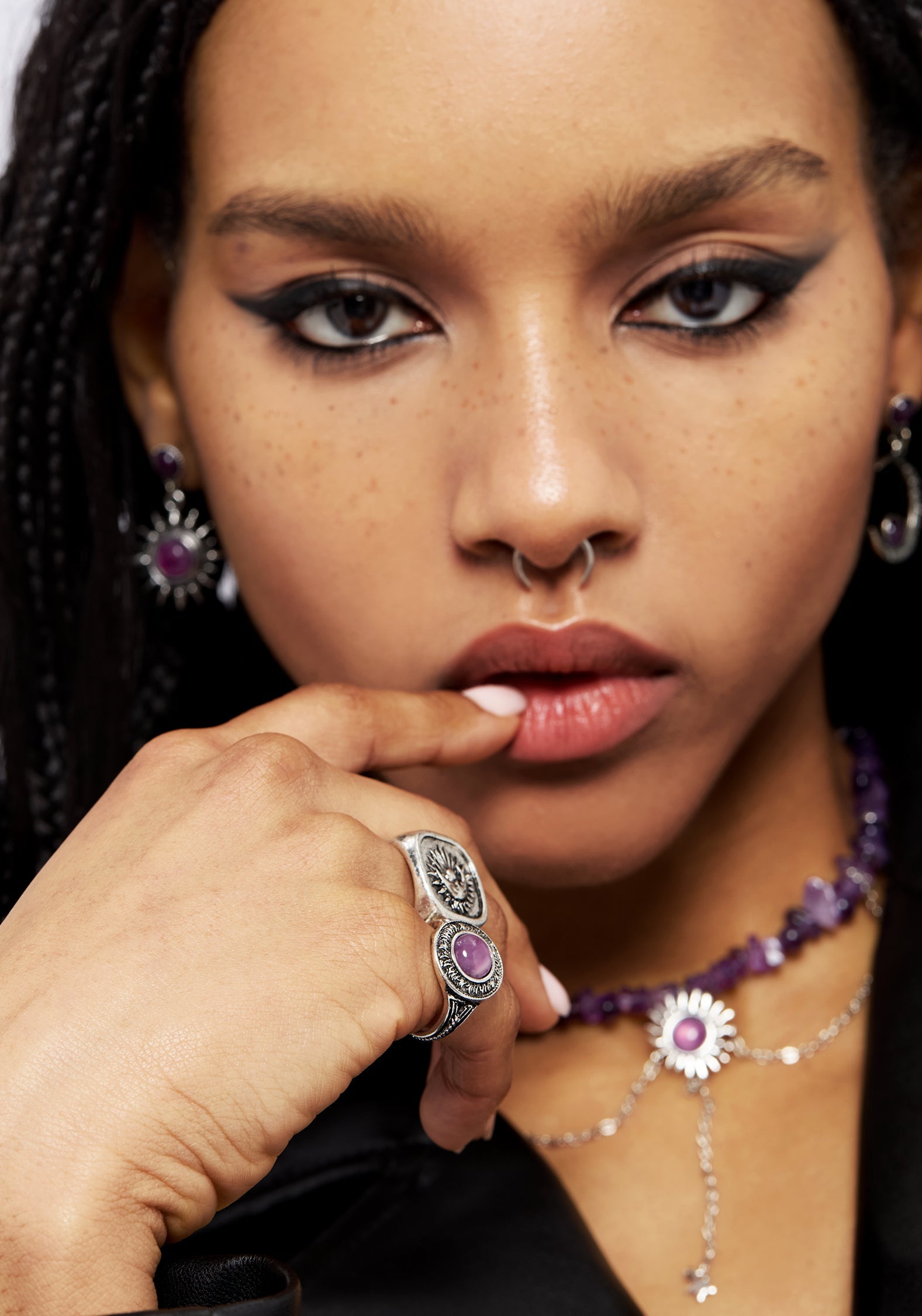 A silver-plated ring set inspired celestial movements: an embossed halo ring set with a purple gem & a chunky signet ring featuring solar eclipse motif.