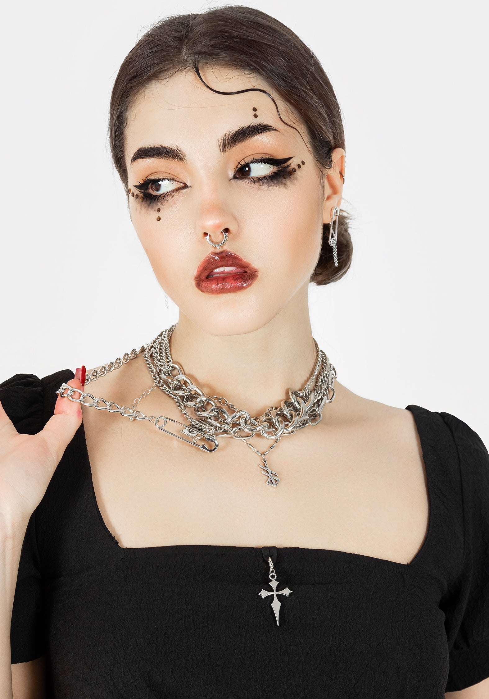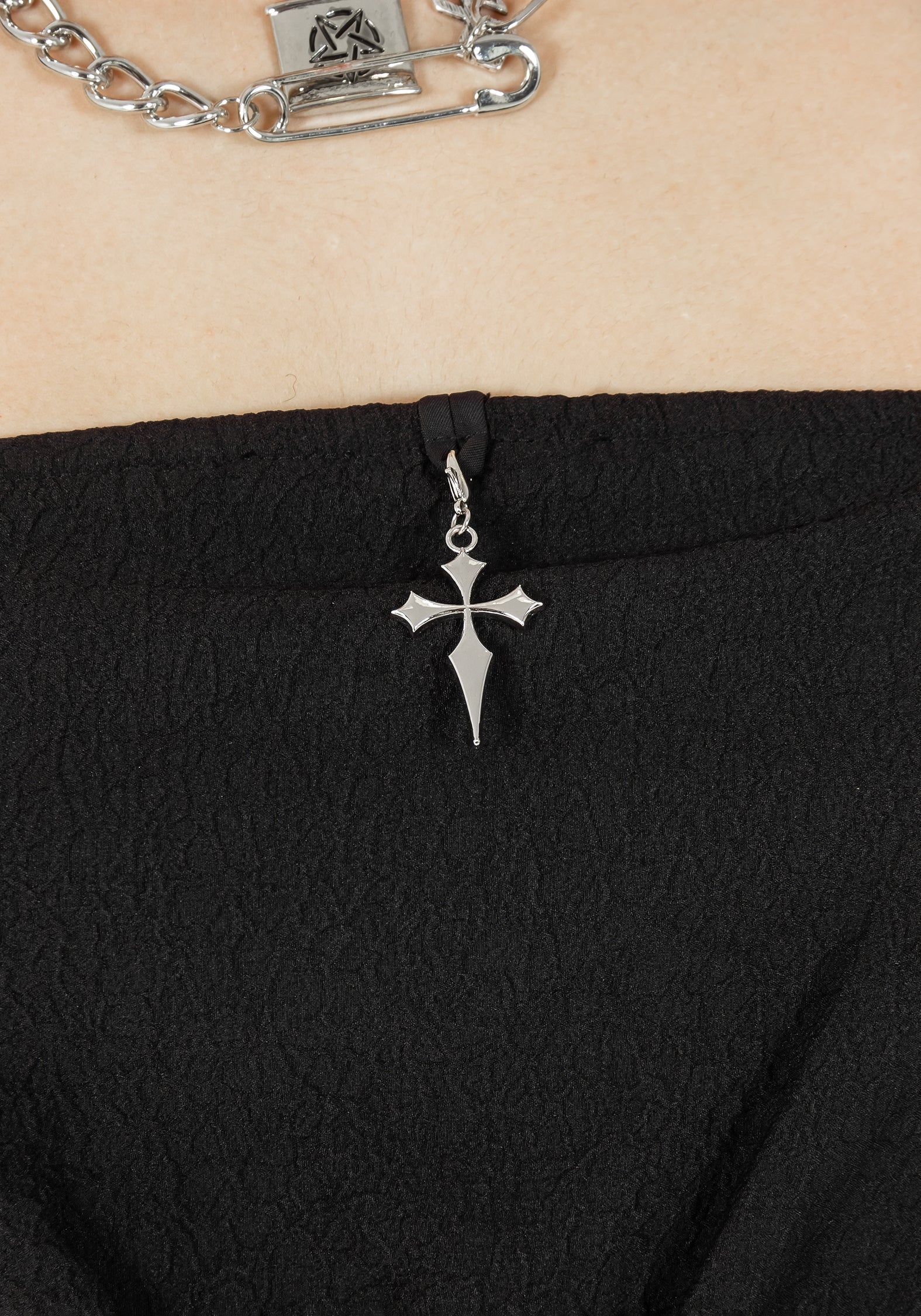 - Silver cross charm attaches to neckline via lobster clasp (removable for easy washing