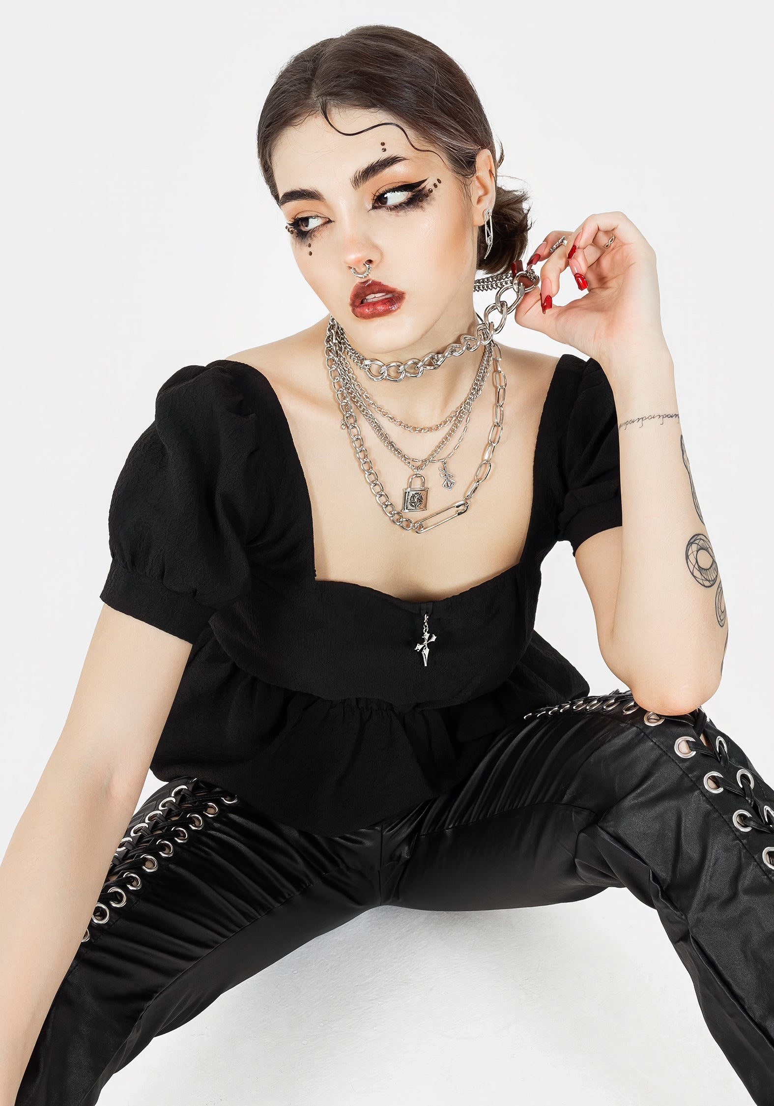 - Black peplum top with silver charm