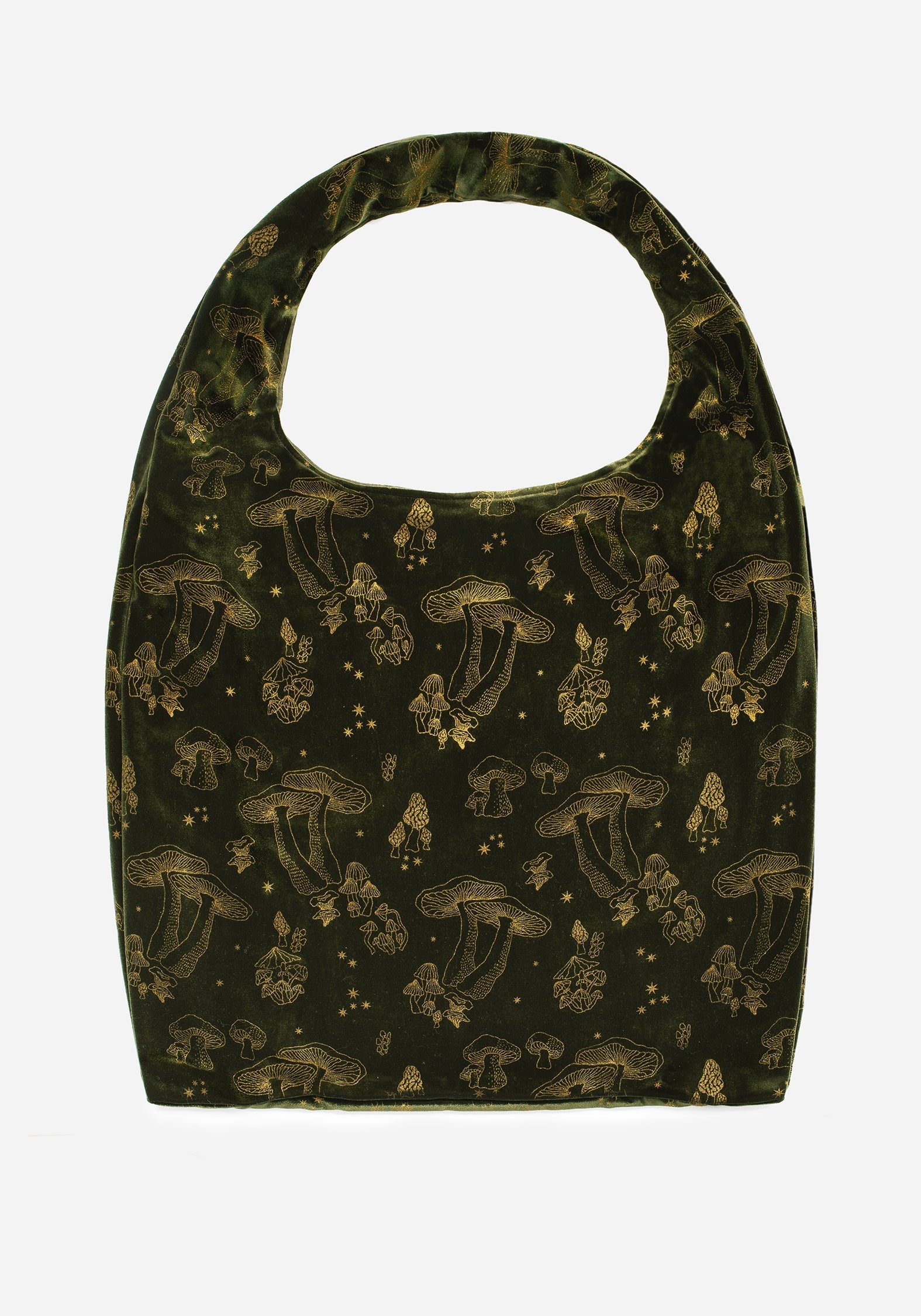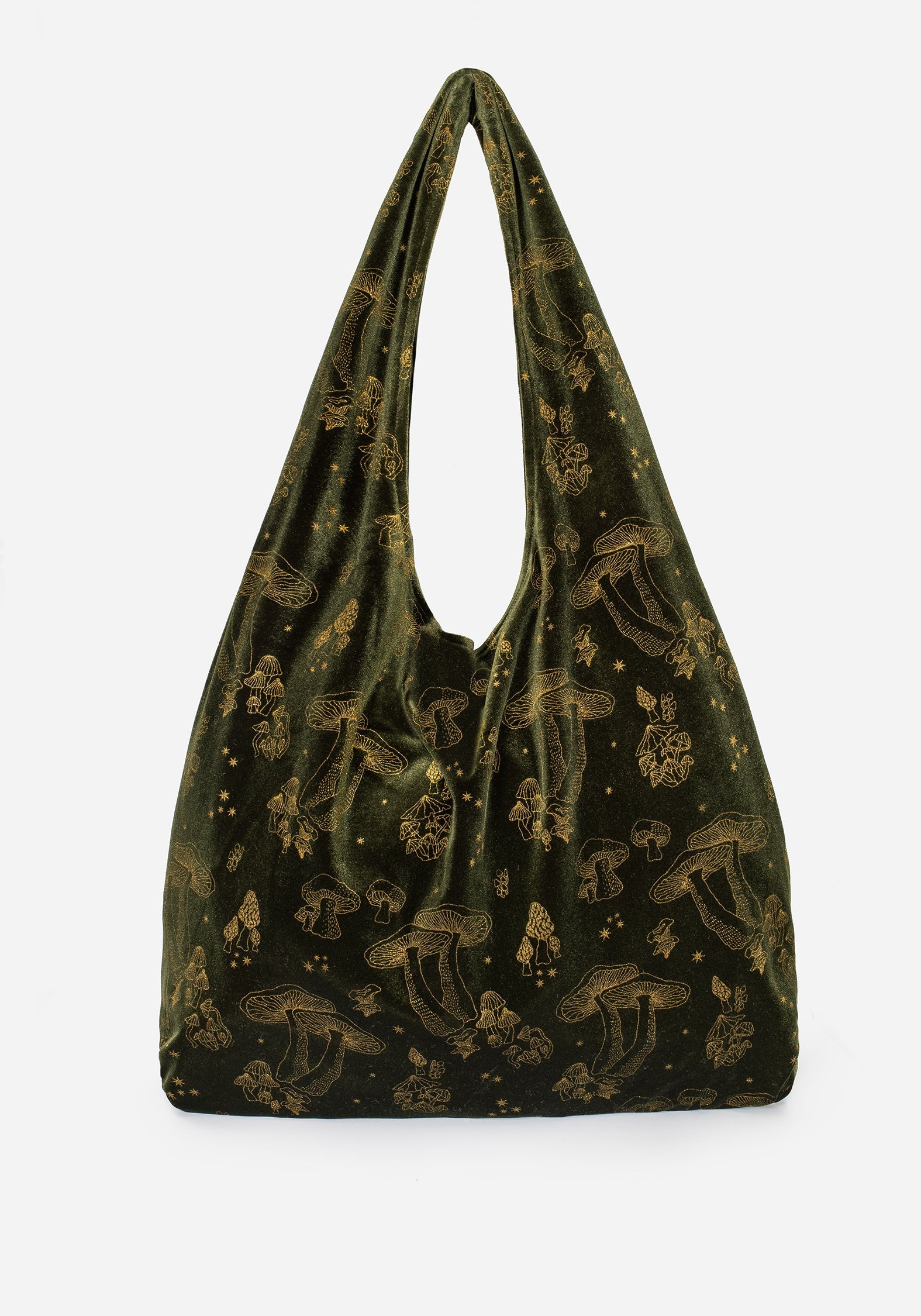 - Sumptuous stretch velour fabrication with an all-over celestial mushroom foil print