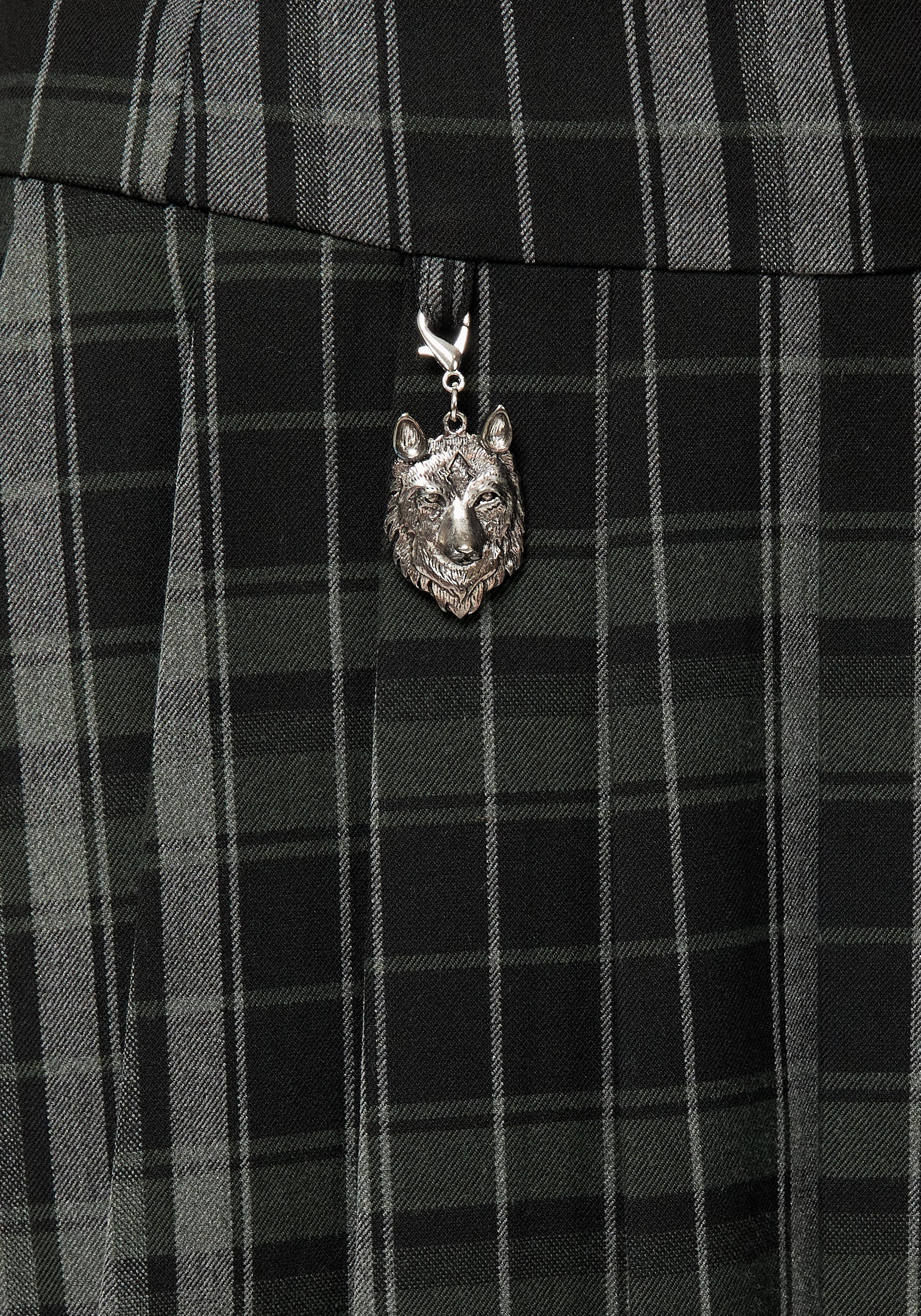 - Silver wolf head charm hangs from waistband (removable via lobster clasp for easy washing)