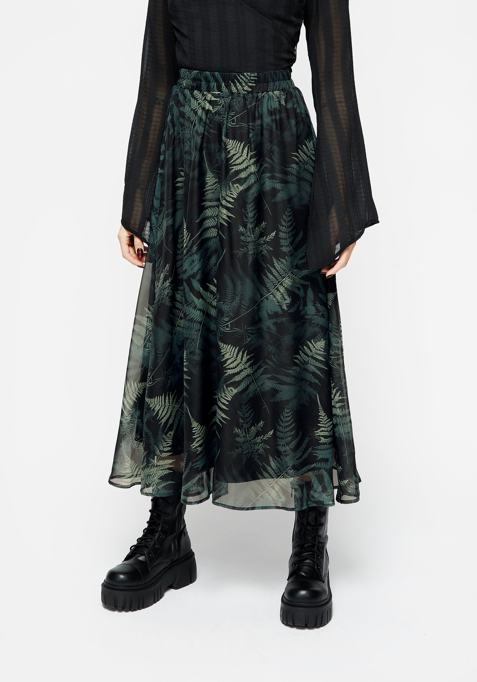 - Midaxi-length skirt falls from gathered waistband in soft pleats