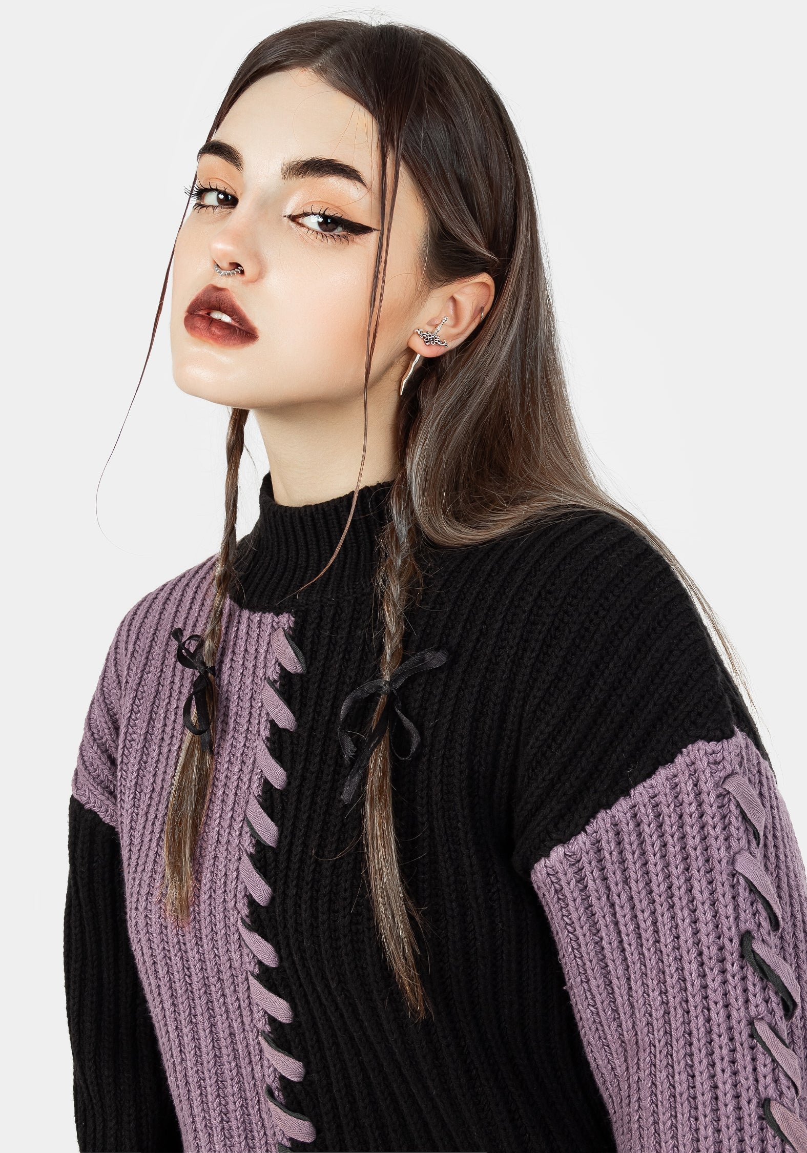 - Chunky black & lilac knit fabric spliced together for a thrown-together look