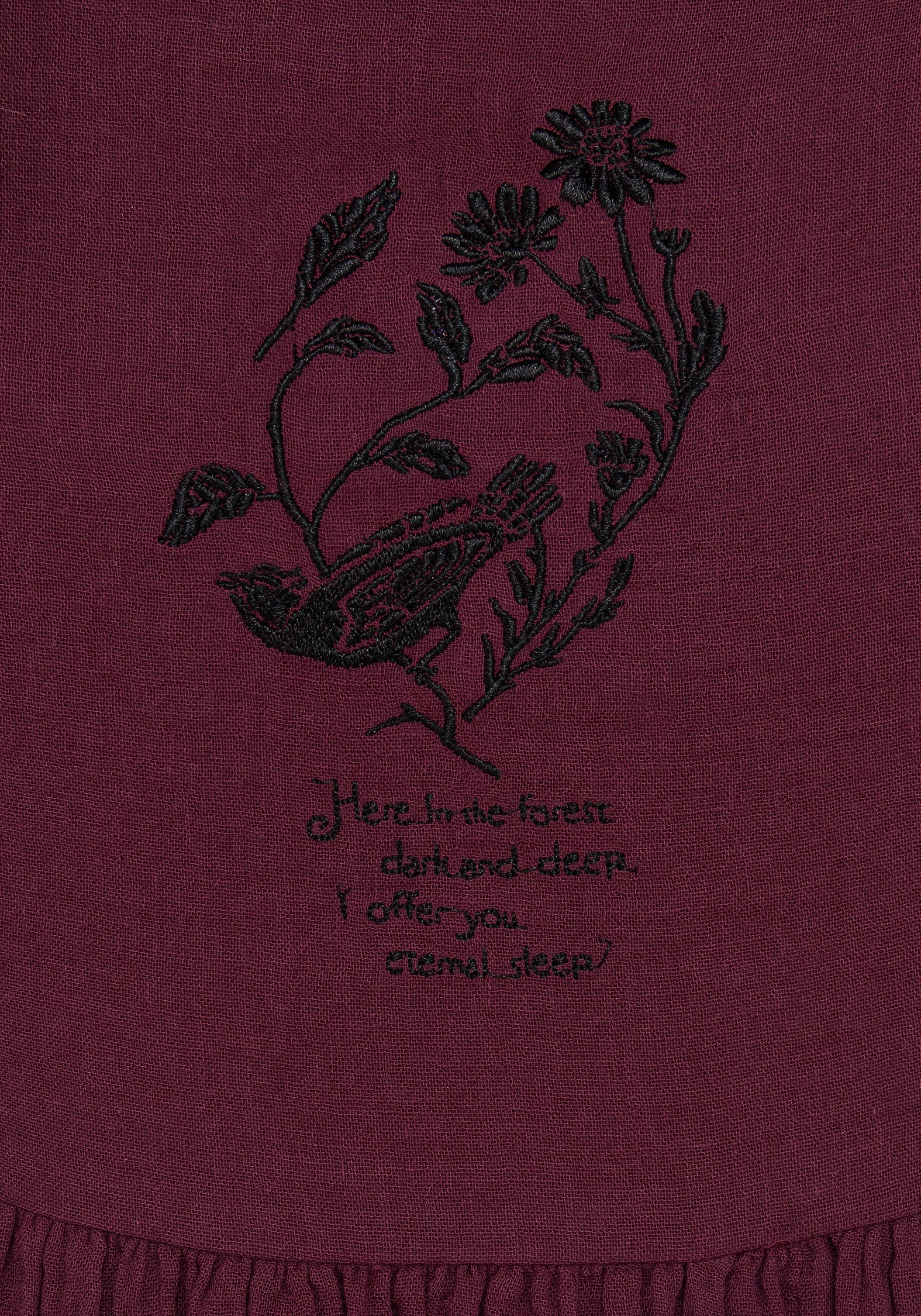 - Contrasting black bird & florals slogan embroidery on front bodice