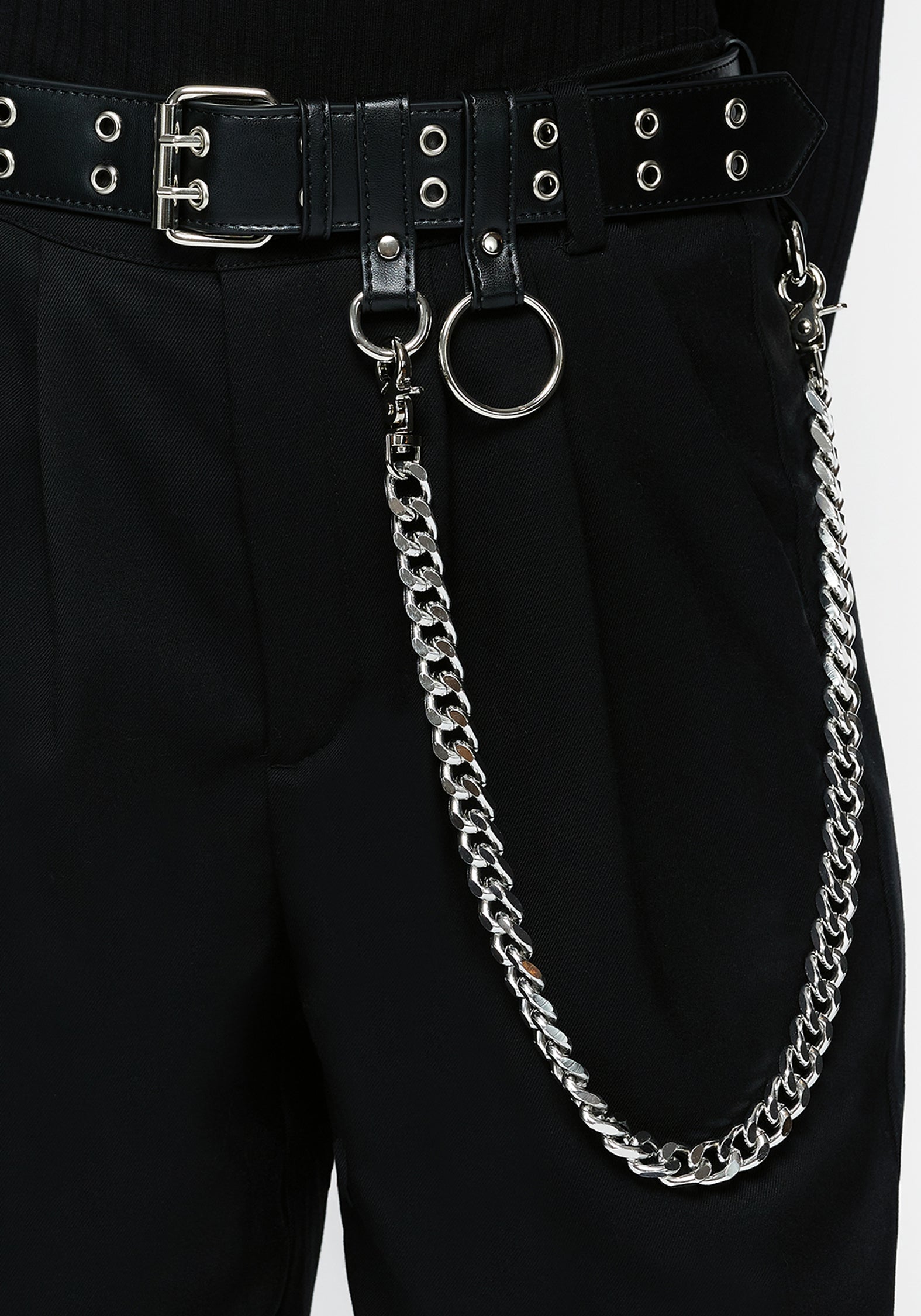 - Chunky silver chain attaches to moveable belt loops via lobster claps