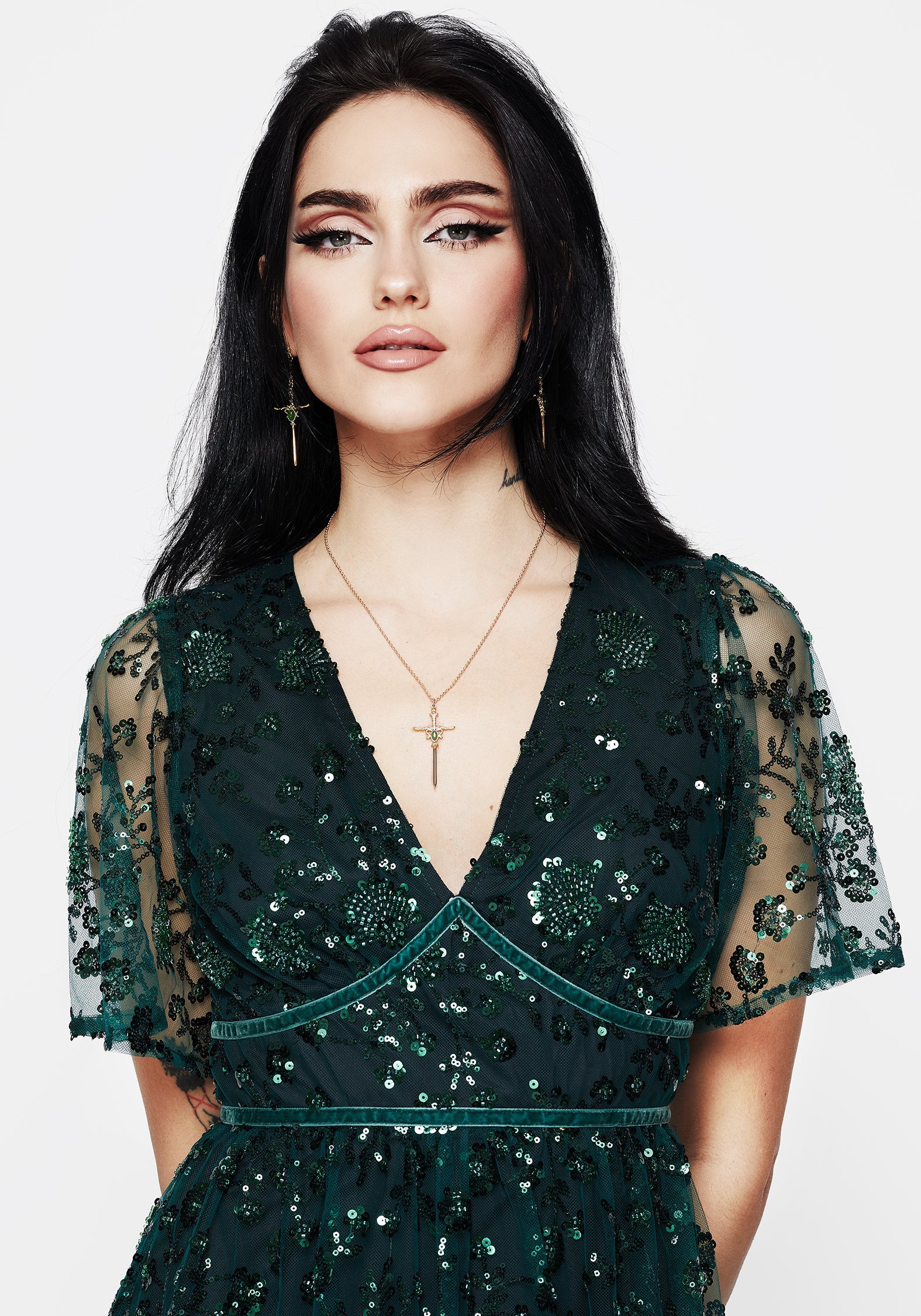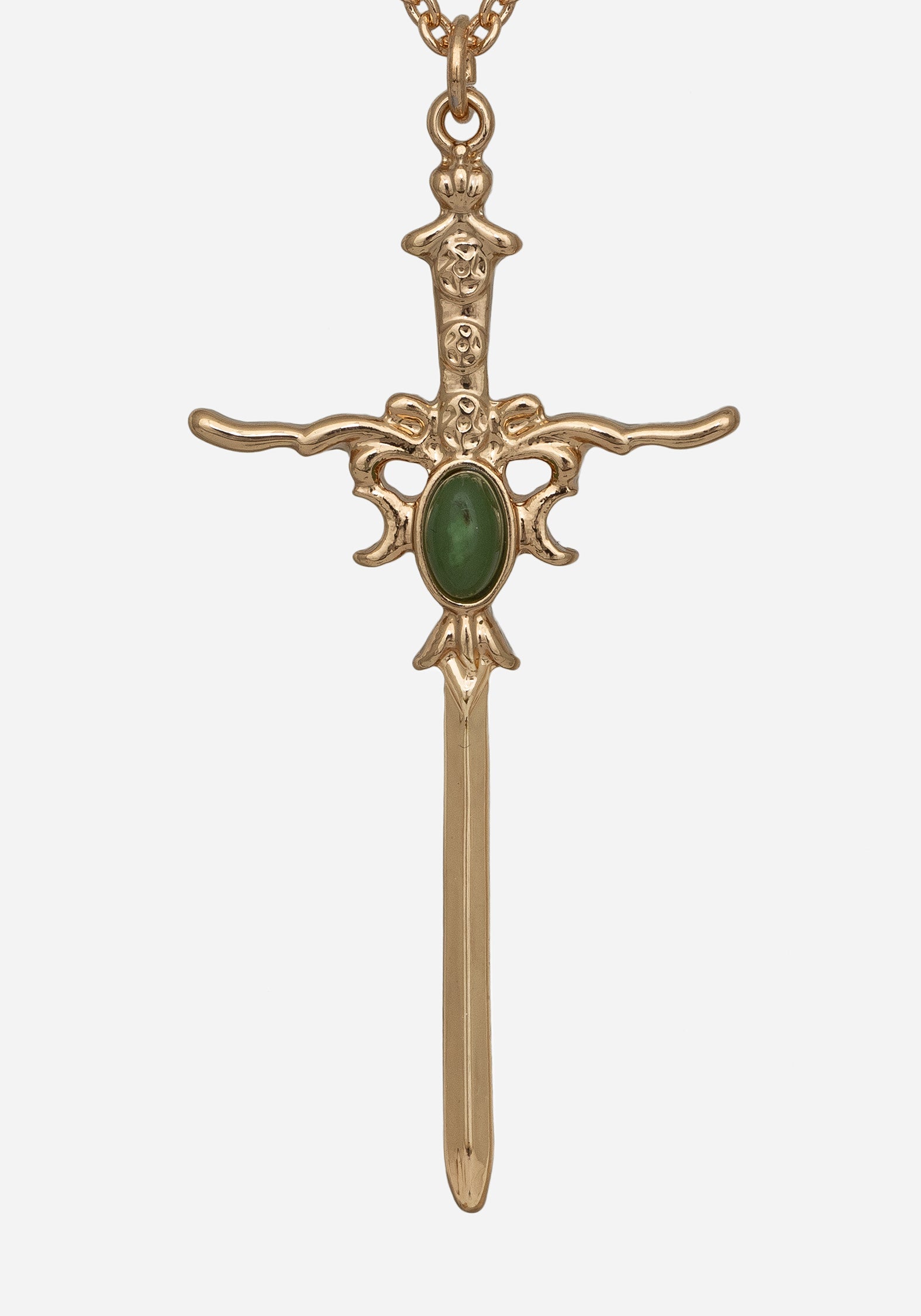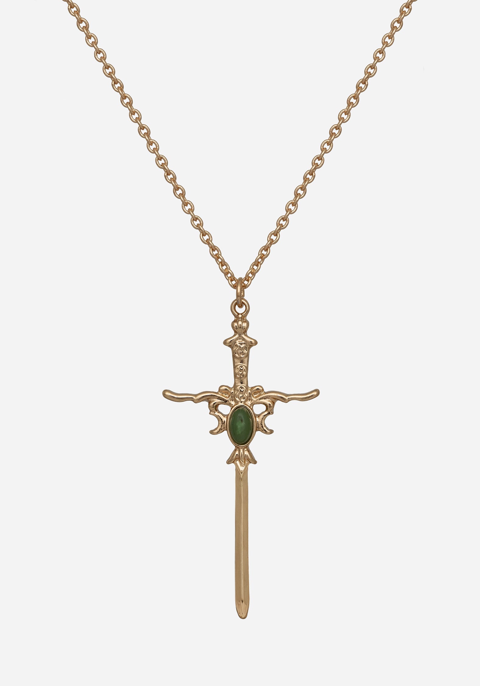 Why wait for a knight in shining armour when can make your own adventures? This green stone encrusted sword pendant in an ethereal golden colour features delicate moulding on its hilt. It hangs from a dainty chain - look closer to spy the subtle pentacle inscriptions and channel their protective energy.
