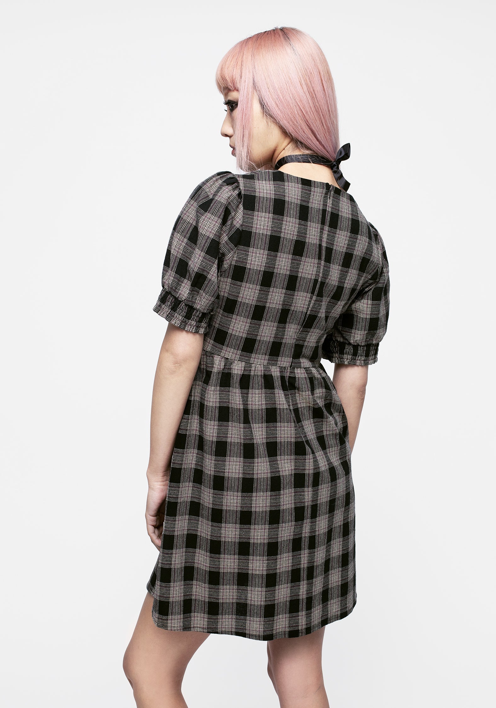 - Woven fabrication features a warm cream check on a black background with lilac accents