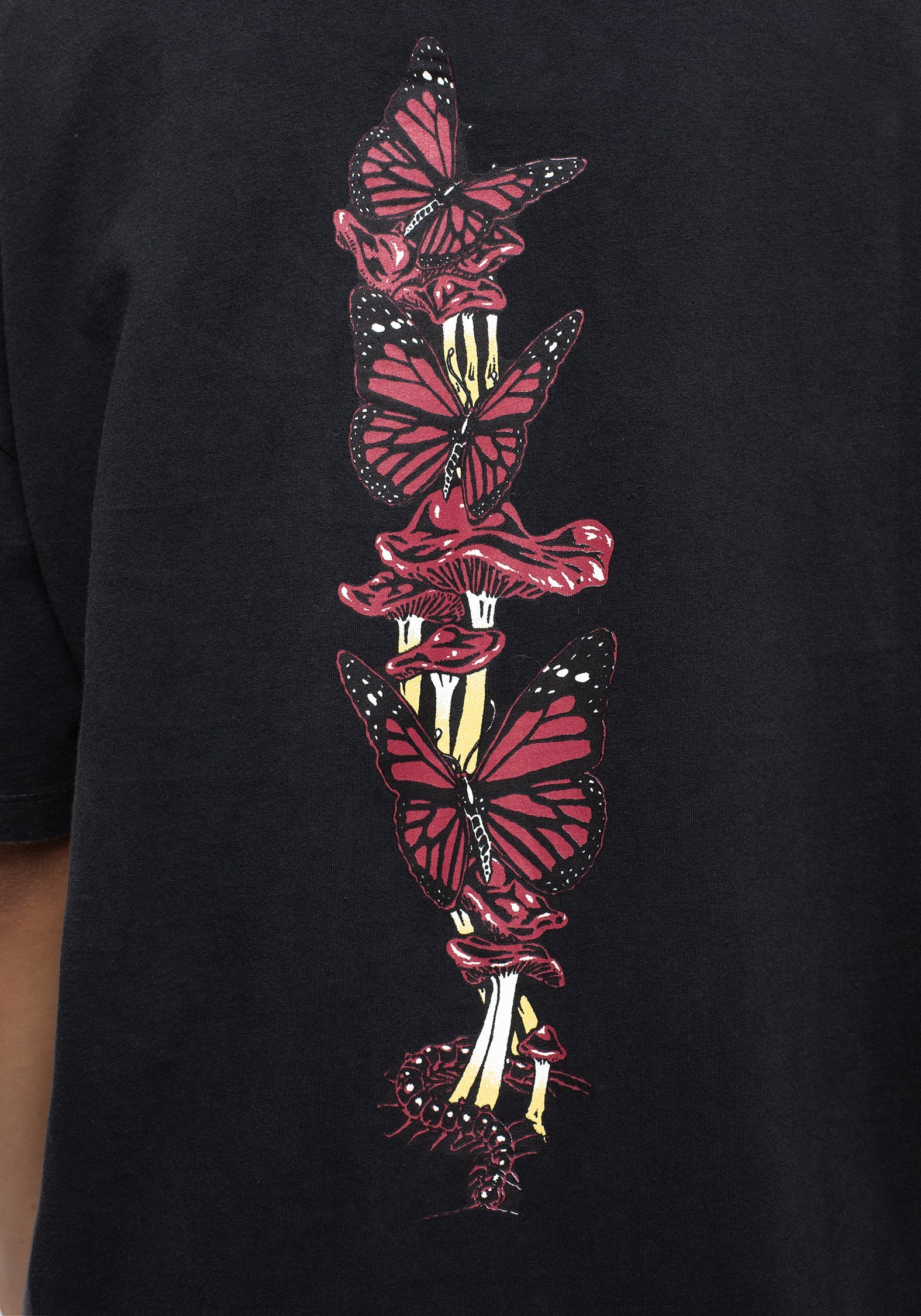 - Red & yellow eyes, skull & mushroom print on centre-front & centre-back