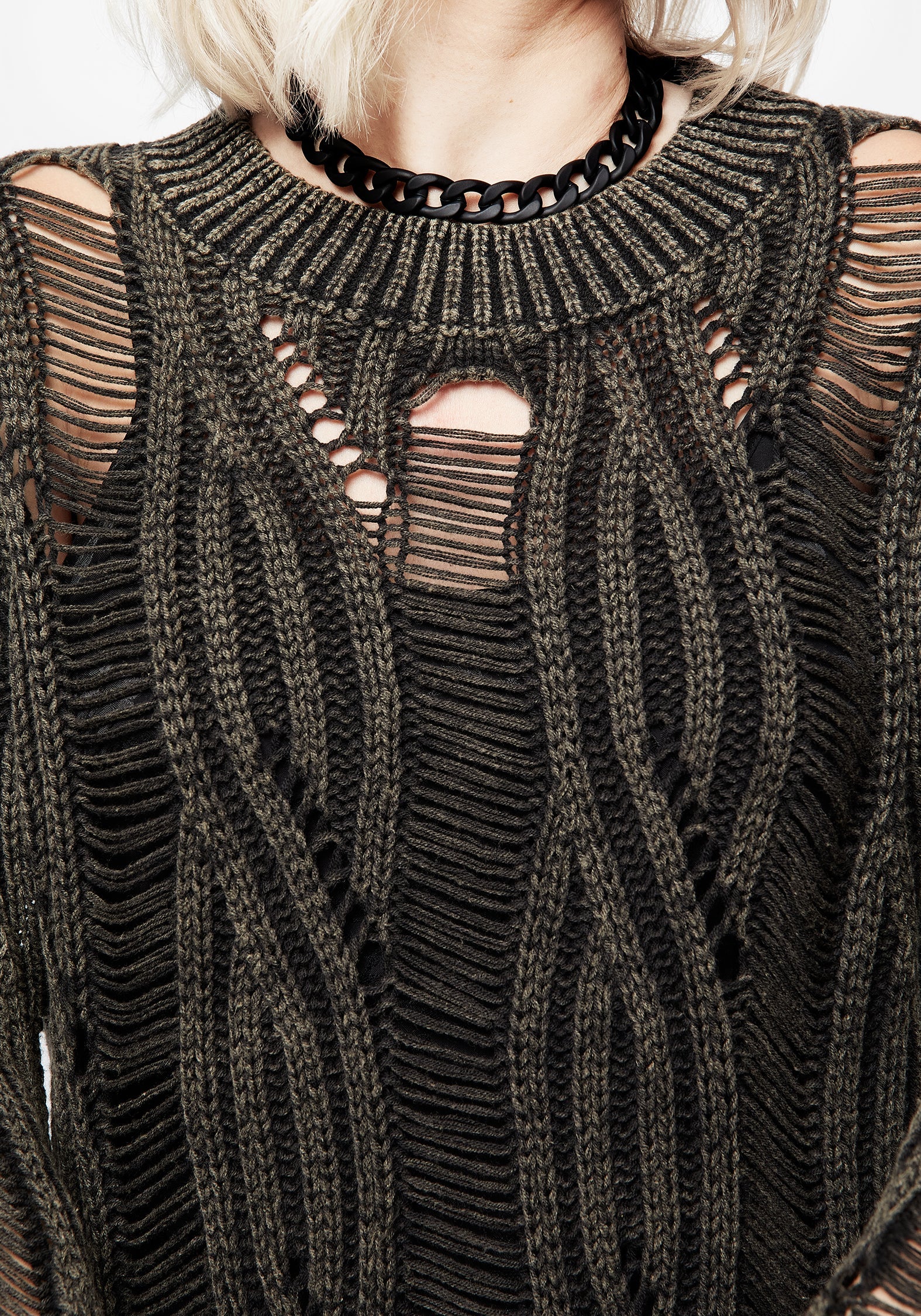 - Soft green-grey yarn in a distressed, unravelled cable knit inspired design