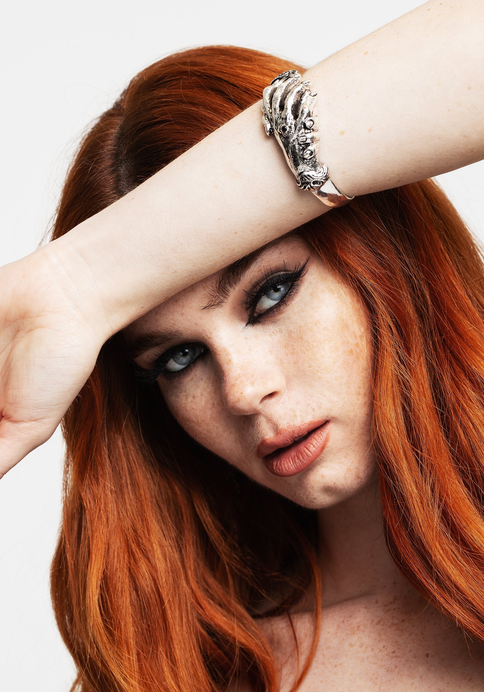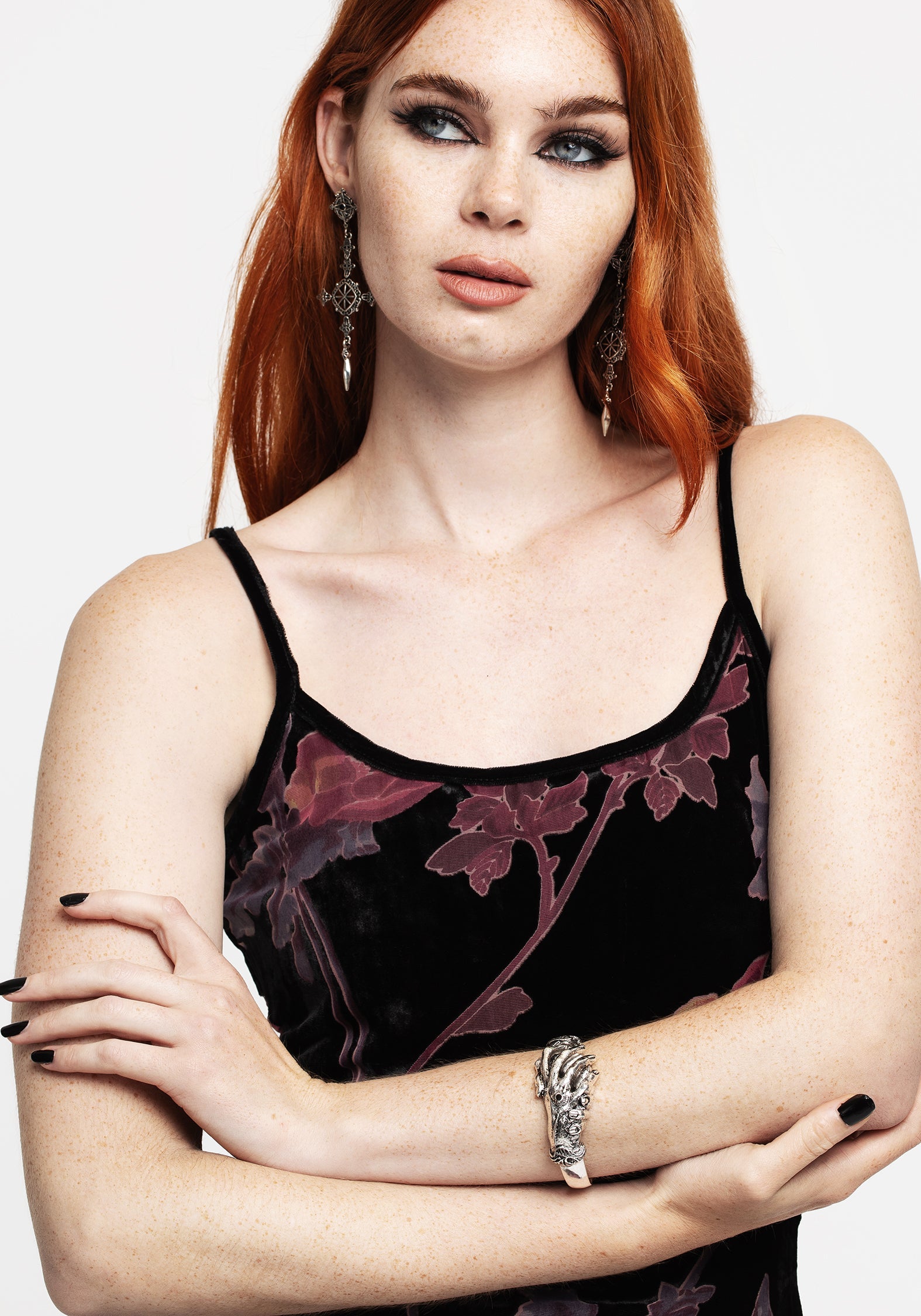 Two hands clasp each other & around your wrist to make this bangle the bold visual statement you need. Finished with a black gem & an antique silver effect for an aged look.