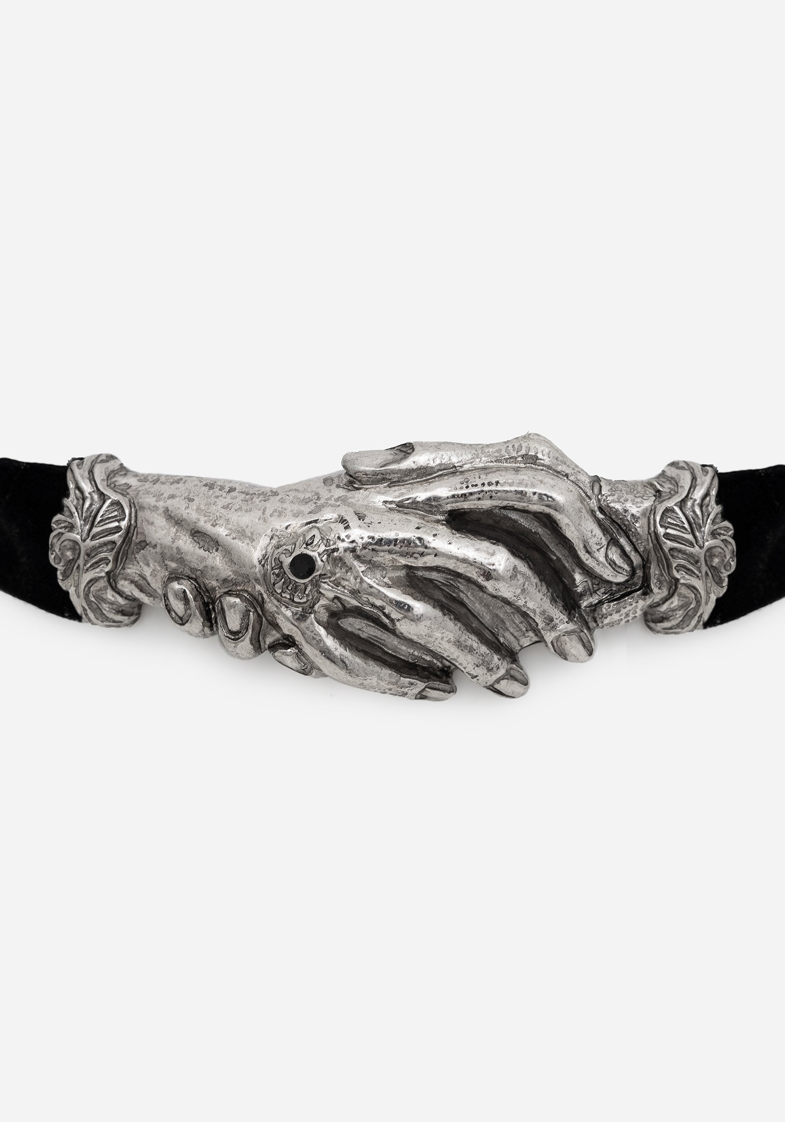 Two hands clasp each other & around your neck to make this choker necklace the bold visual statement you need. Velour ribbons can by tied in a bow at any length for a comfortable fit. Finished with a black gem & an antique silver effect for an aged look.
