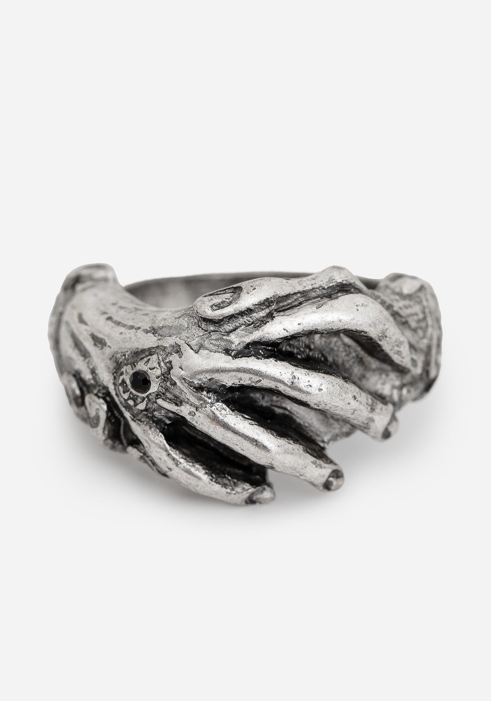 Two hands clasp each other & around your finger to make this ring the bold visual statement you need. Finished with a black gem & antiqued real silver plate for an aged look.